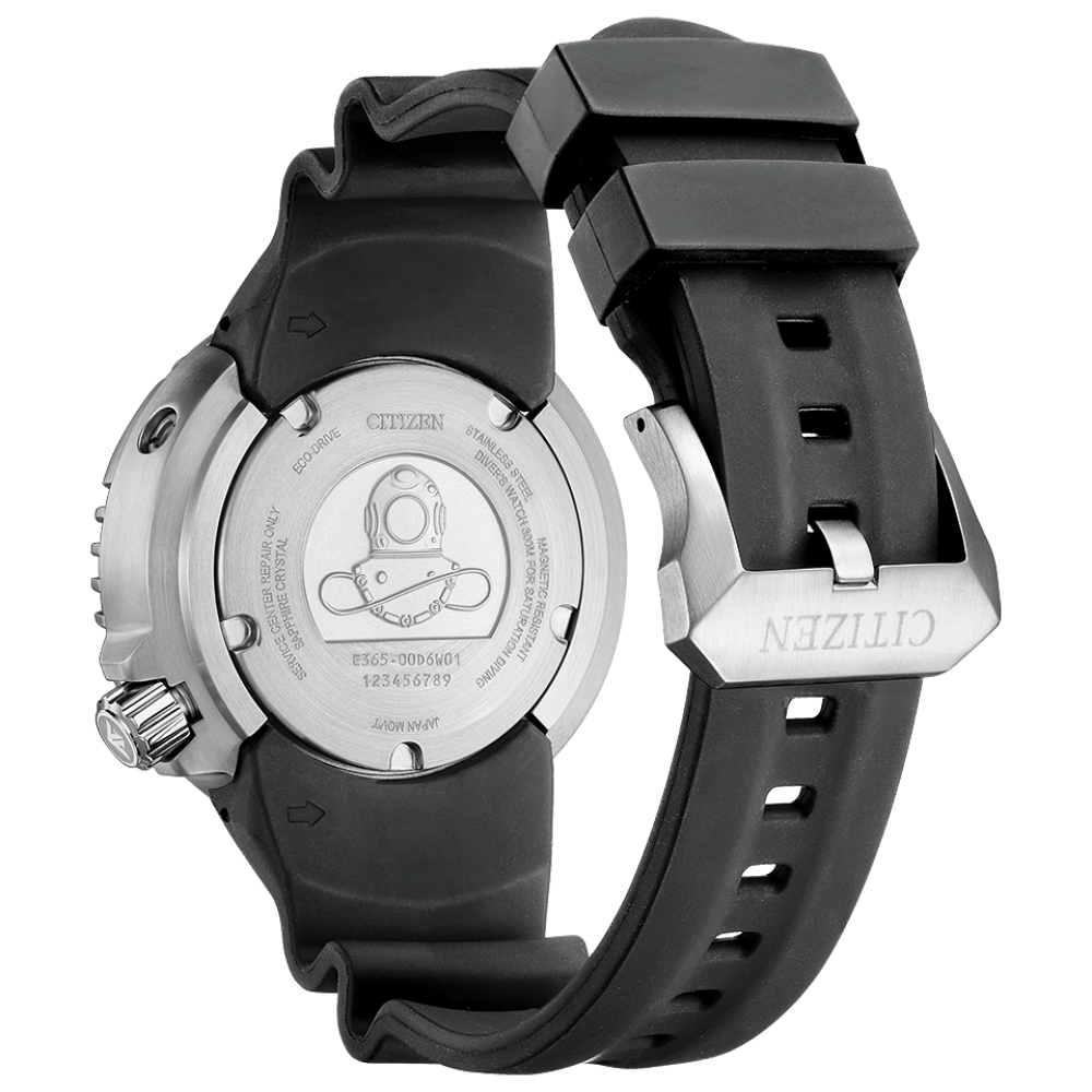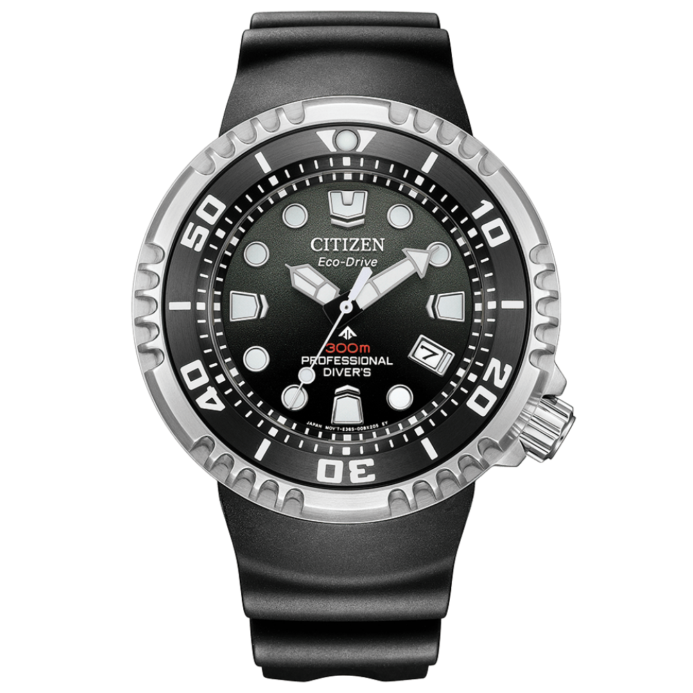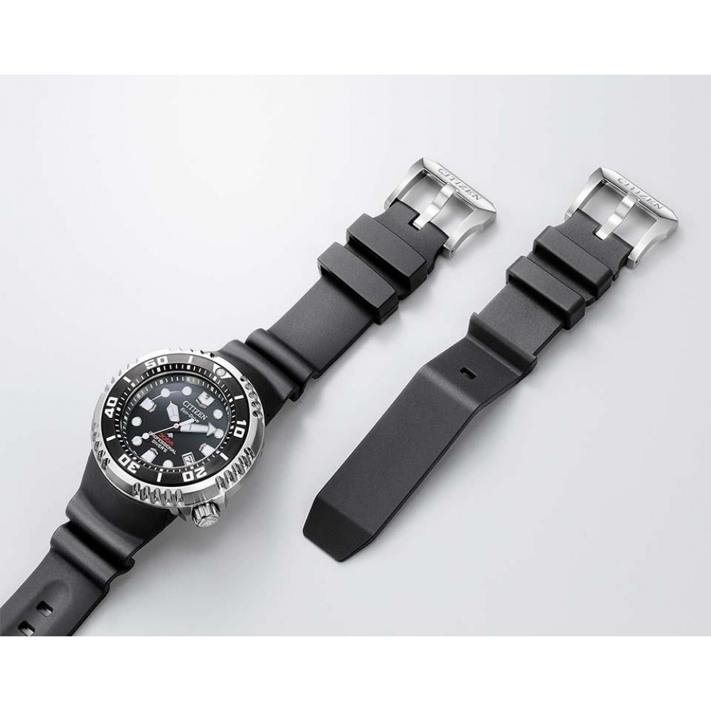 Citizen Promaster Marine BN1024-01E - men's watch produced by Citizen. It has Japanese solar quartz movement and E365 calibre. Stainless steel case of round shape. Case dimensions are 46 mm. in diameter and 16.3 mm. in thickness. The dial of this Citizen watch is black. Display type: analog. This timepiece has sapphire, antireflection coating glass. Biomass urethane (benebiol™) band, band color: black. 300 m. water resistance. The watch is from Promaster collection. The following features are equipped: antimagnetic, screw-down crown, glowing hands, glowing markers, date.
