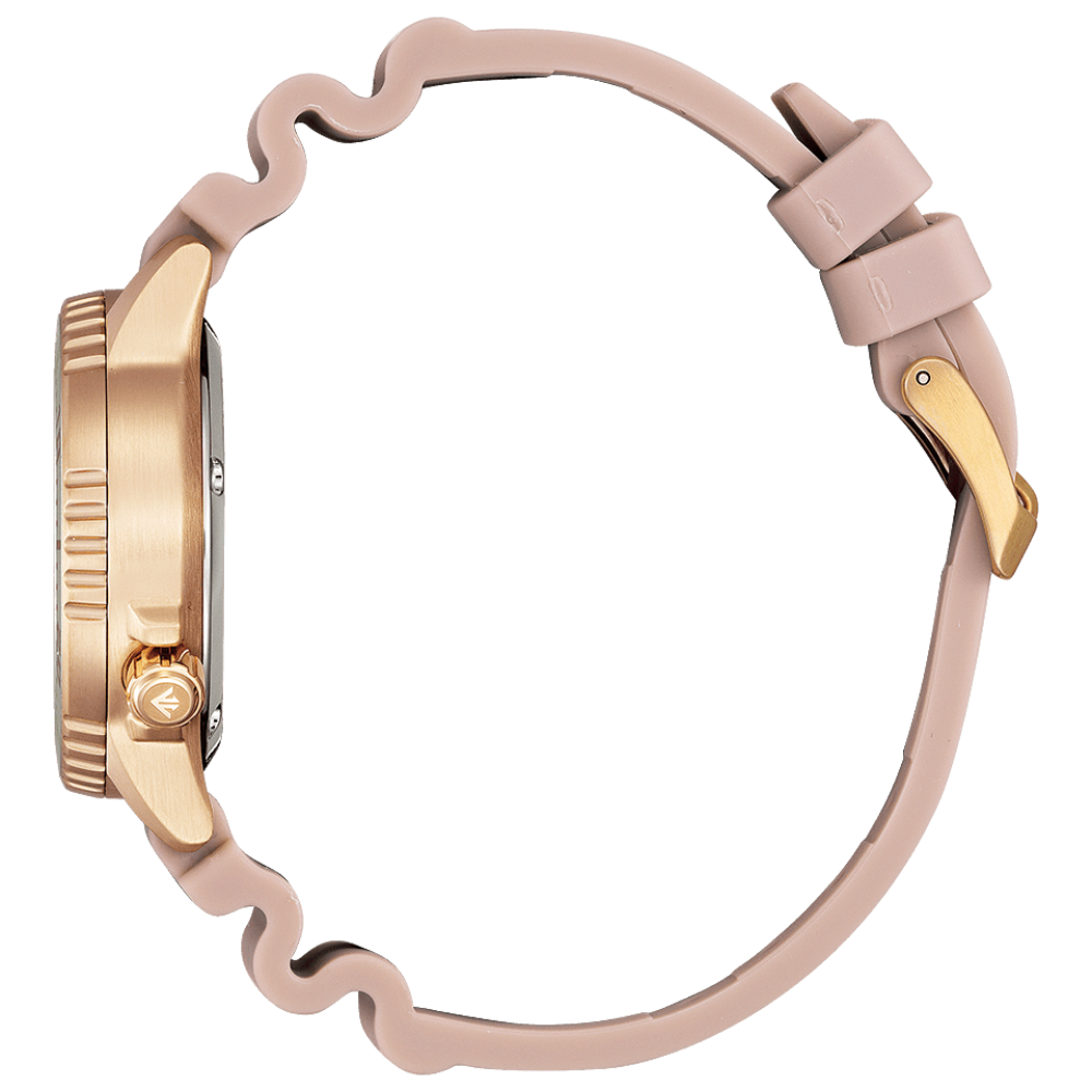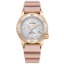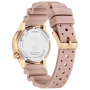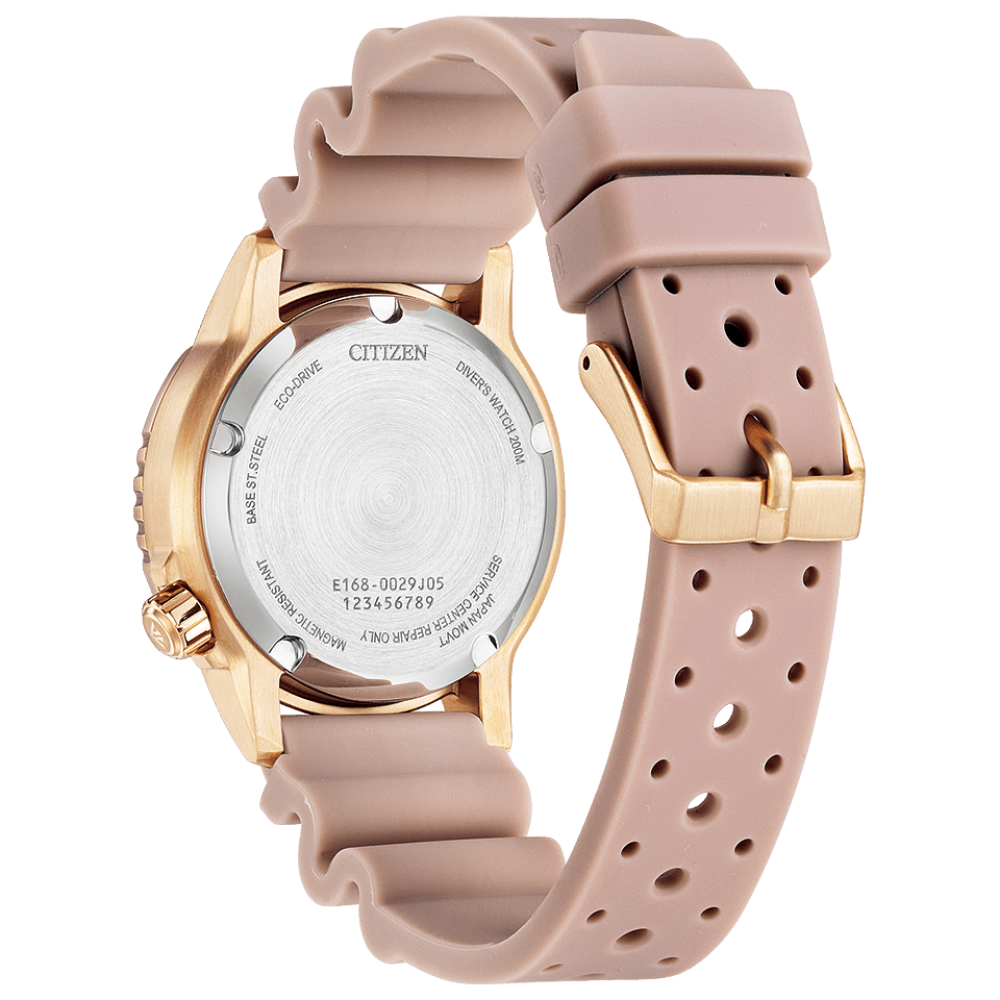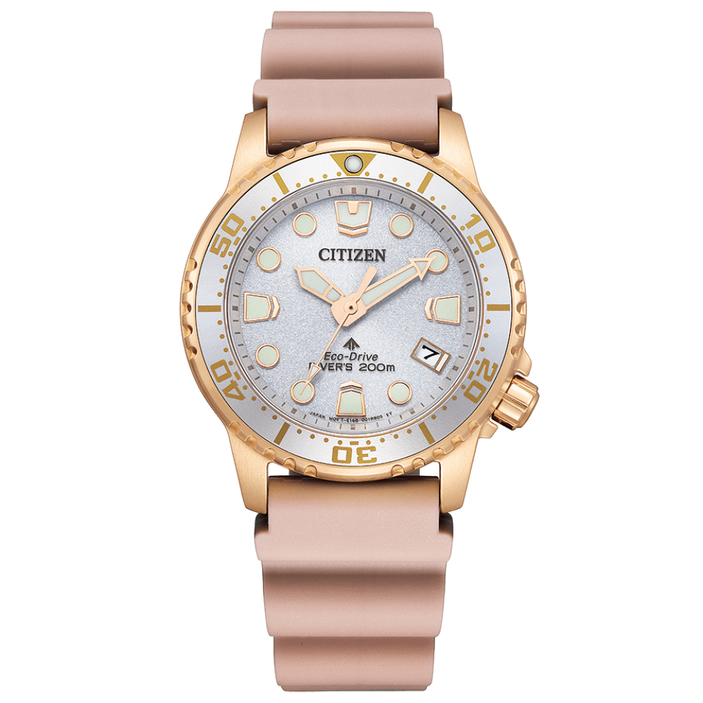 Citizen Promaster Marine Eco-Drive Diver 200m EO2023-00A - unisex watch produced by Citizen. It is equipped with Japanese solar quartz movement and E168 calibre. Stainless steel, gold plated case of round shape. Case dimensions are 36.5 mm. in diameter and 11.6 mm. in thickness. The dial of this Citizen watch is silver. Display type: analog. This timepiece has mineral glass. Urethane band, band color: light pink. 200 m. water resistance. The watch is from Promaster collection. The following features are equipped: antimagnetic, screw-down crown, glowing hands, glowing markers, date.