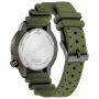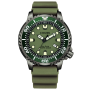 Citizen Promaster Marine The Moment of Adventure BN0157-11X - men's watch made by Citizen. It is equipped with Japanese solar quartz movement and E168 calibre. Stainless steel, hard coating case of round shape. Case dimensions are 44 mm. in diameter and 11.5 mm. in thickness. The dial of this Citizen watch is green. Display type: analog. This timepiece has mineral glass. Polymer band, band color: green. 200 m. water resistance. The watch is from Promaster collection. The following features are equipped: antimagnetic, glowing hands, glowing markers, screw-down crown, date.