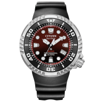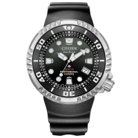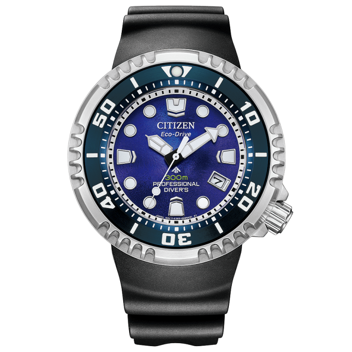 Citizen Promaster Marine UNITE with BLUE Limited Edition BN1025-08L - men's watch manufactured by Citizen. It has Japanese solar quartz movement and E365 calibre. Stainless steel case of round shape. Case dimensions are 46 mm. in diameter and 16.3 mm. in thickness. The dial of this Citizen watch is blue. Display type: analog. This timepiece has sapphire, antireflection coating glass. Biomass urethane (benebiol™) band, band color: black. 300 m. water resistance. The watch is from Promaster collection. The following features are equipped: antimagnetic, screw-down crown, glowing hands, glowing markers, date, limited edition.