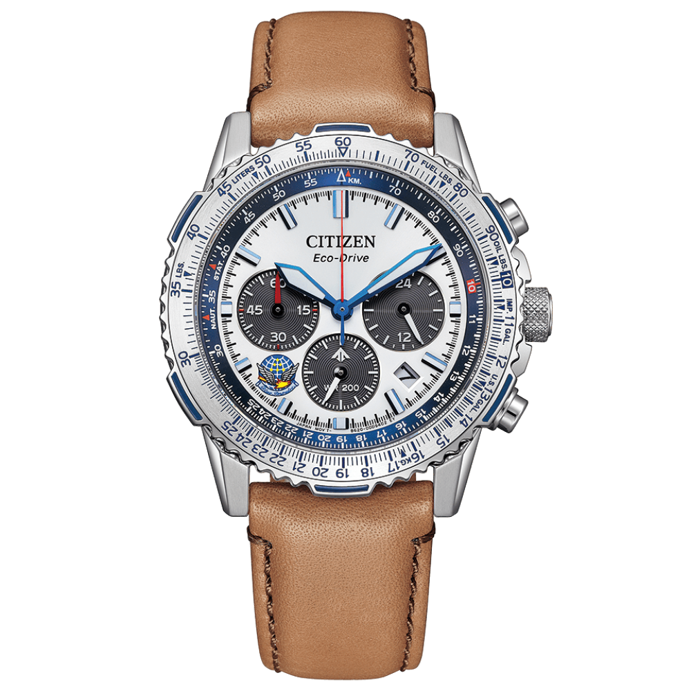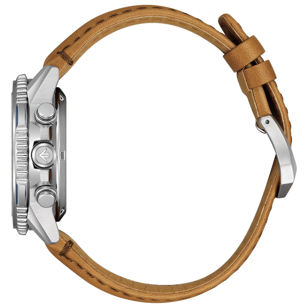 Citizen Promaster Sky Blue Impulse Limited Edition CA4661-09A - men's watch manufactured by Citizen. It has Japanese solar quartz movement and B620 calibre. Stainless steel case of round shape. Case dimensions are 40 mm. in diameter and 13.5 mm. in thickness. The dial of this Citizen watch is silver. Display type: analog. This timepiece has sapphire, antireflection coating glass. Cowhide leather band, band color: brown. 200 m. water resistance. The watch is from Promaster collection. The following features are equipped: antimagnetic, glowing hands, glowing markers, slide rule, date, chronograph, limited edition.