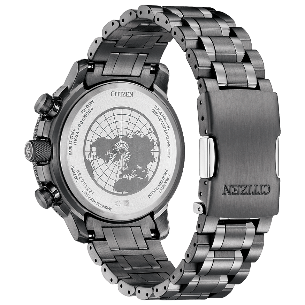 Radio Controlled, Antimagnetic, Screw-down Crown, Slide Rule, Glowing Hands, Glowing Markers, Power Reserve Indicator, Perpetual Calendar, Date, Day, World Time
