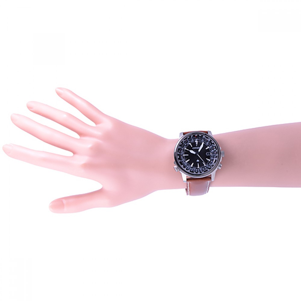 CITIZEN PROMASTER SKY CB0134-00E - men's watch made by Citizen. It is equipped with Japanese solar quartz movement and H145 calibre. Titanium, hard coating case of round shape. Case dimensions are 43.7 mm. in diameter and 11.6 mm. in thickness. The dial of this Citizen watch is black. Display type: analog. This timepiece has sapphire, antireflection coating glass. Leather band, band color: brown. 200 m. water resistance. The watch is from Promaster collection. The following features are equipped: radio controlled, world time, perpetual calendar, date, glowing hands, glowing markers, antimagnetic, power reserve indicator.