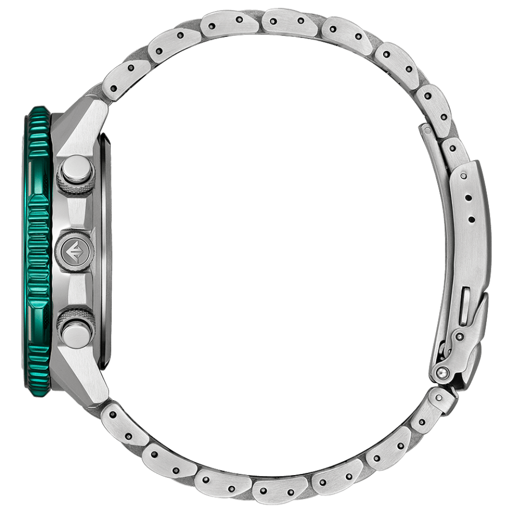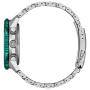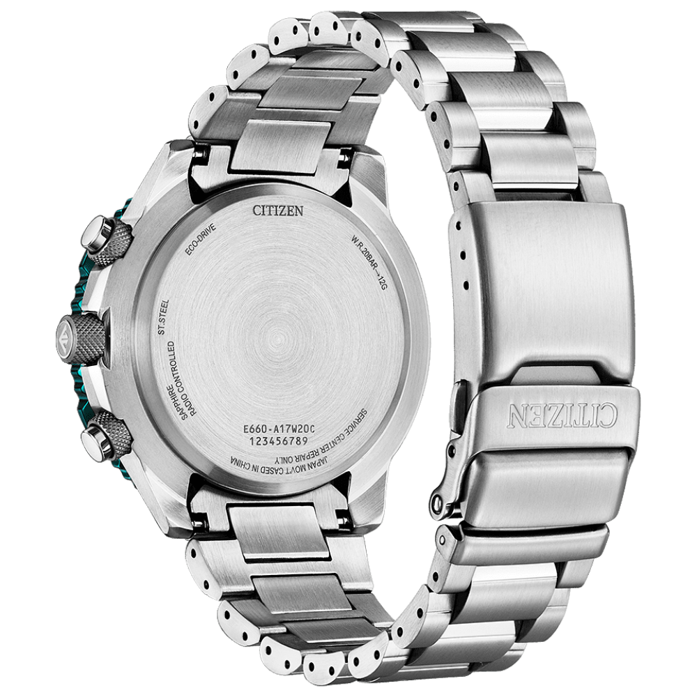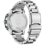 Citizen Promaster Sky CB5004-59W - men's watch produced by Citizen. It has Japanese solar quartz movement and E660 calibre. Stainless steel case of round shape. Case dimensions are 45.9 mm. in diameter and 13.7 mm. in thickness. The dial of this Citizen watch is green. Display type: analog. This timepiece has sapphire, antireflection coating glass. Stainless steel band, band color: silver. 200 m. water resistance. The watch is from Promaster collection. The following features are equipped: radio controlled, glowing hands, glowing markers, slide rule, power reserve indicator, chronograph, world time, alarm, date, day, perpetual calendar.
