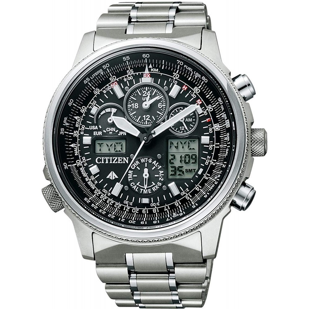 CITIZEN PROMASTER SKY PMV65-2271 - men's watch manufactured by Citizen. It has Japanese solar quartz movement and U680 calibre. Titanium, hard coating case of round shape. Case dimensions are 45 mm. in diameter and 14.1 mm. in thickness. The dial of this Citizen watch is black. Display type: analog. This timepiece has sapphire, antireflection coating glass. Titanium, hard coating band, band color: silver. 200 m. water resistance. The watch is from Promaster collection. The following features are equipped: radio controlled, date, alarm, chronograph, world time, perpetual calendar, backlight, antimagnetic, power reserve indicator, countdown timer, glowing hands, glowing markers.