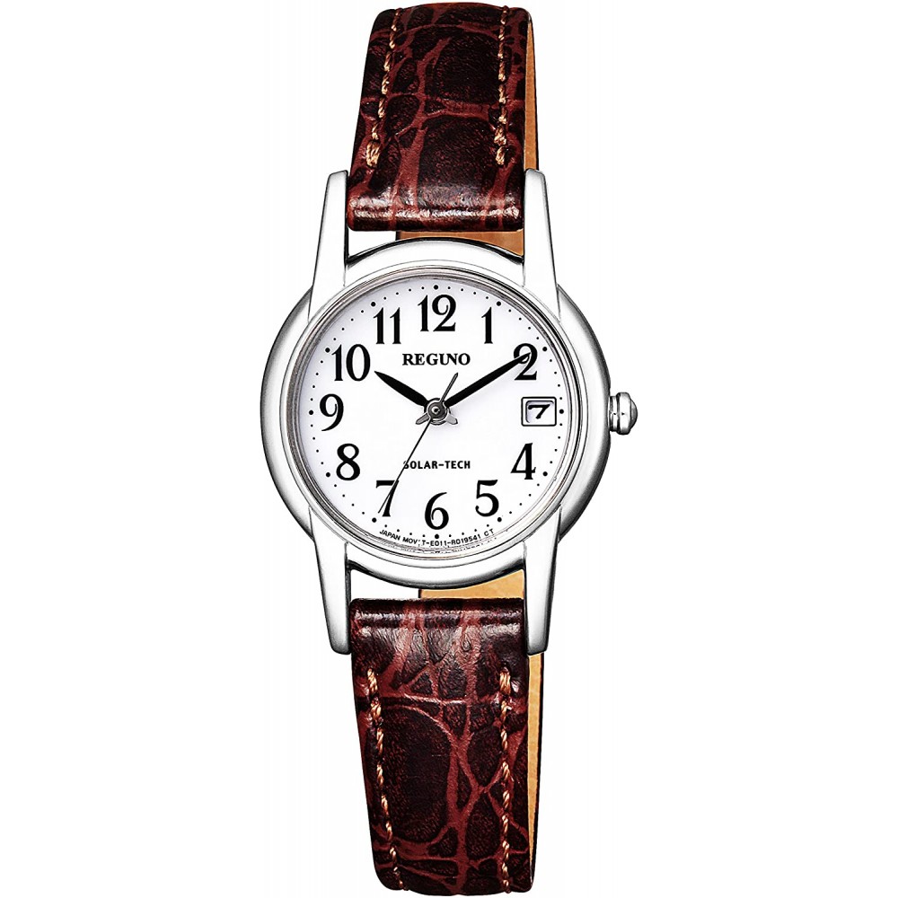 Citizen Reguno KH4-815-10 - ladies watch produced by Citizen. It has Japanese solar quartz movement and E011 calibre. Stainless steel case of round shape. Case dimensions are 24.2 mm. in diameter and 7.3 mm. in thickness. The dial of this Citizen watch is white. Display type: analog. This timepiece has mineral glass. Leather band, band color: brown. 30 m. water resistance. The watch is from Citizen Reguno collection. The following features are equipped: date.