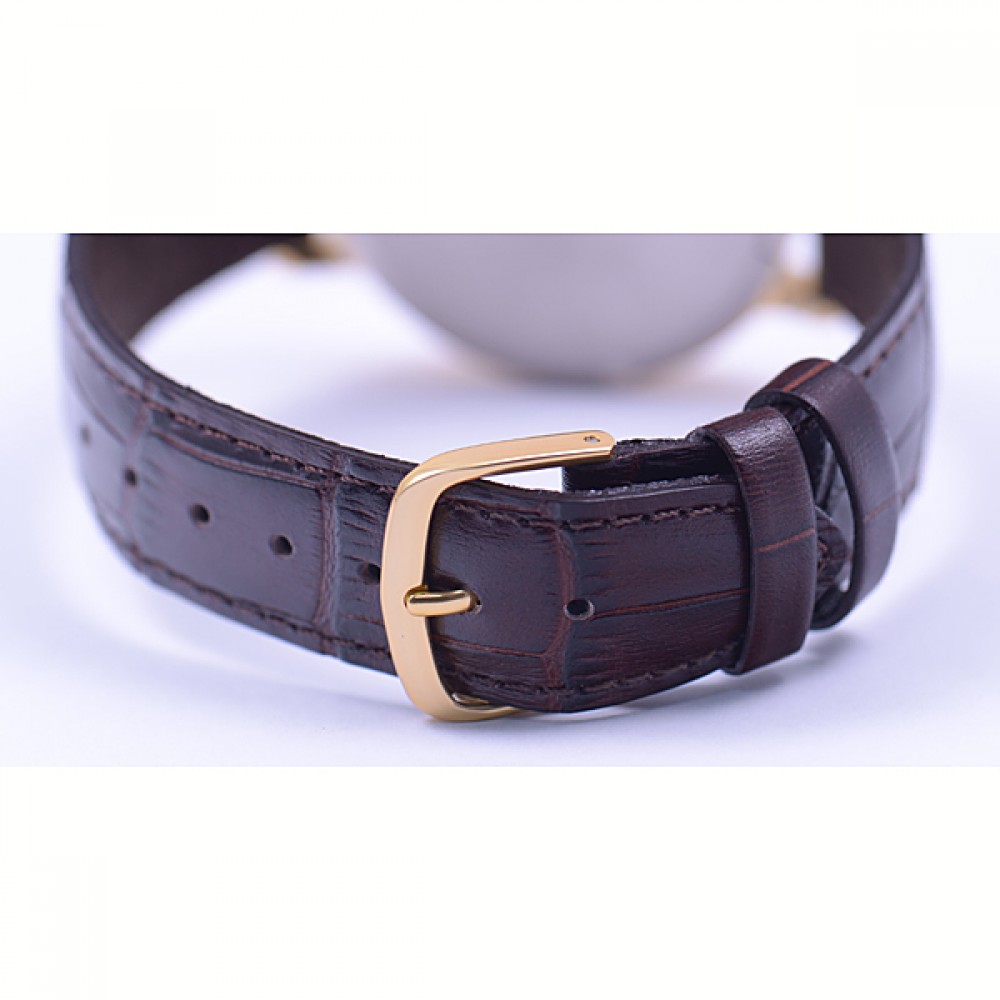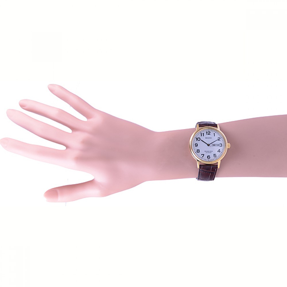 CITIZEN REGUNO KH5-421-90 - men's watch manufactured by Citizen. It has Japanese solar quartz movement and E101 calibre. Stainless steel, gold plated case of round shape. Case dimensions are 38 mm. in diameter and 9.5 mm. in thickness. The dial of this Citizen watch is white, silver. Display type: analog. This timepiece has mineral glass. Leather band, band color: brown. 100 m. water resistance. The watch is from Citizen Reguno collection. The following features are equipped: date, day.