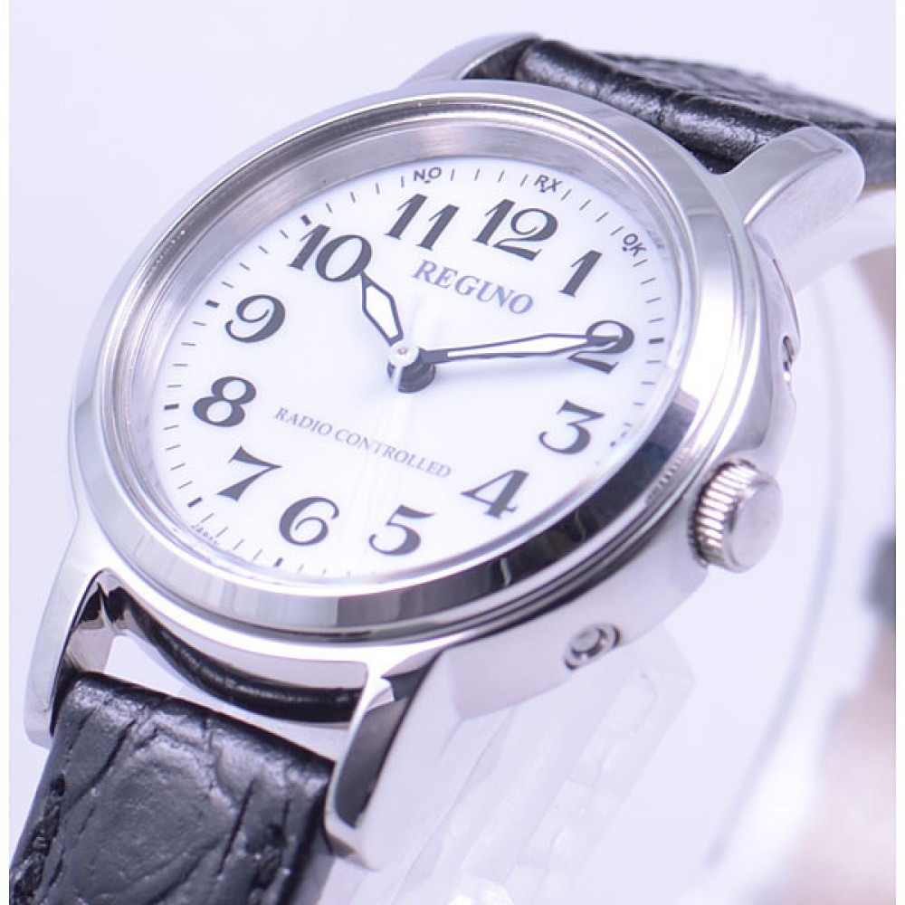 CITIZEN REGUNO KL4-711-10 - ladies watch made by Citizen. It has Japanese solar quartz movement and H335 calibre. Stainless steel case of round shape. Case dimensions are 29 mm. in diameter and 7.9 mm. in thickness. The dial of this Citizen watch is white. Display type: analog. This timepiece has mineral glass. Leather band, band color: black. 50 m. water resistance. The watch is from Citizen Reguno collection. The following features are equipped: radio controlled.