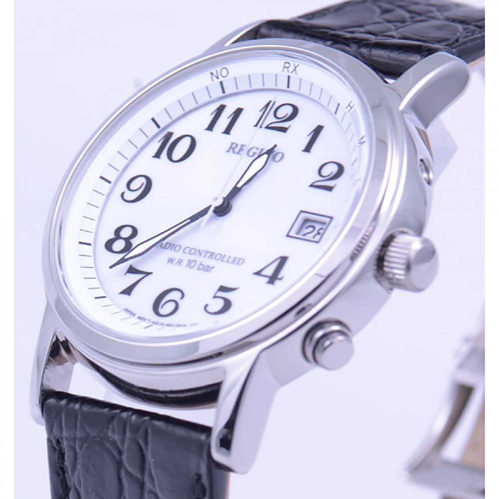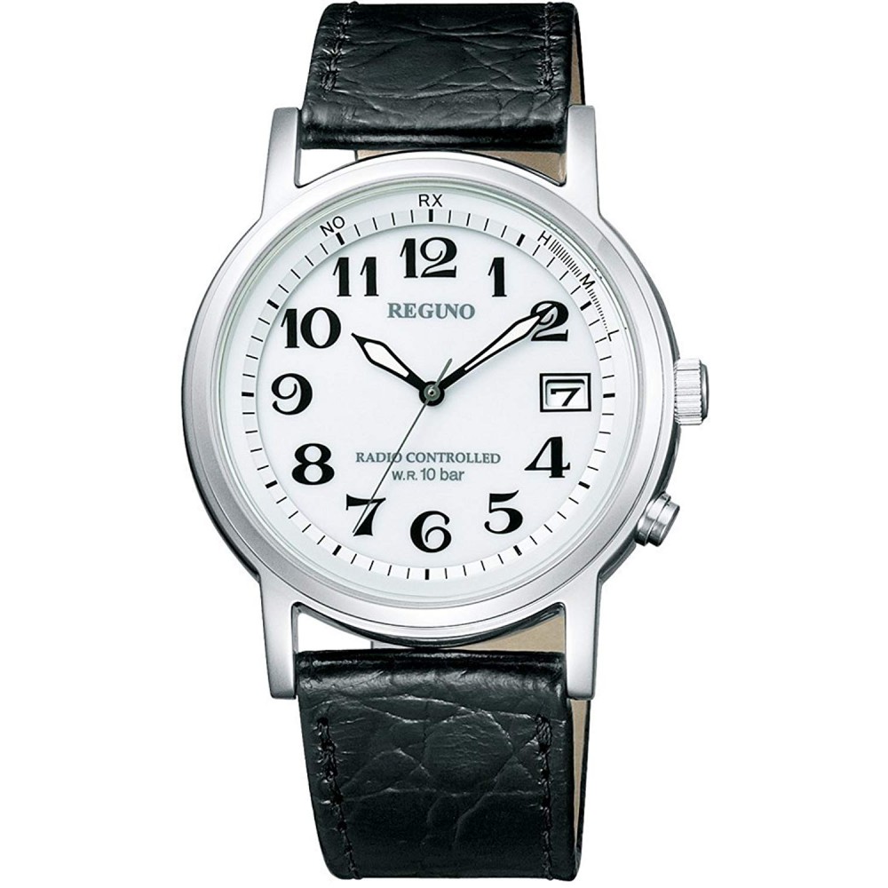 CITIZEN REGUNO KL7-019-10 - men's watch produced by Citizen. It is equipped with Japanese solar quartz movement and H415 calibre. Stainless steel case of round shape. Case dimensions are 37.5 mm. in diameter and 9.1 mm. in thickness. The dial of this Citizen watch is white. Display type: analog. This timepiece has mineral glass. Leather band, band color: black. 100 m. water resistance. The watch is from Citizen Reguno collection. The following features are equipped: date, perpetual calendar, radio controlled.