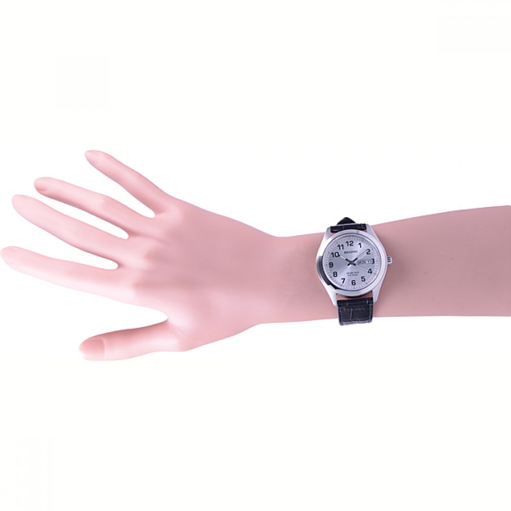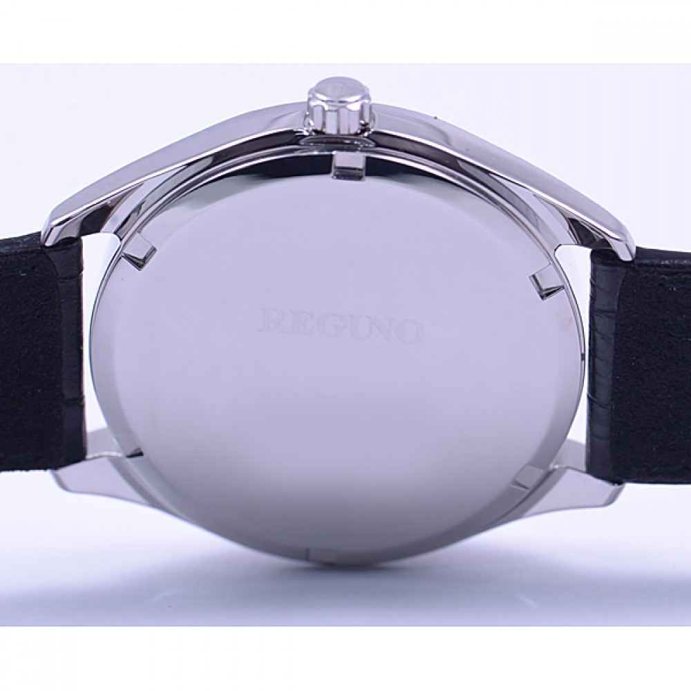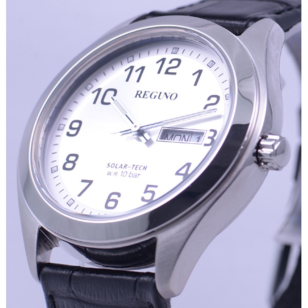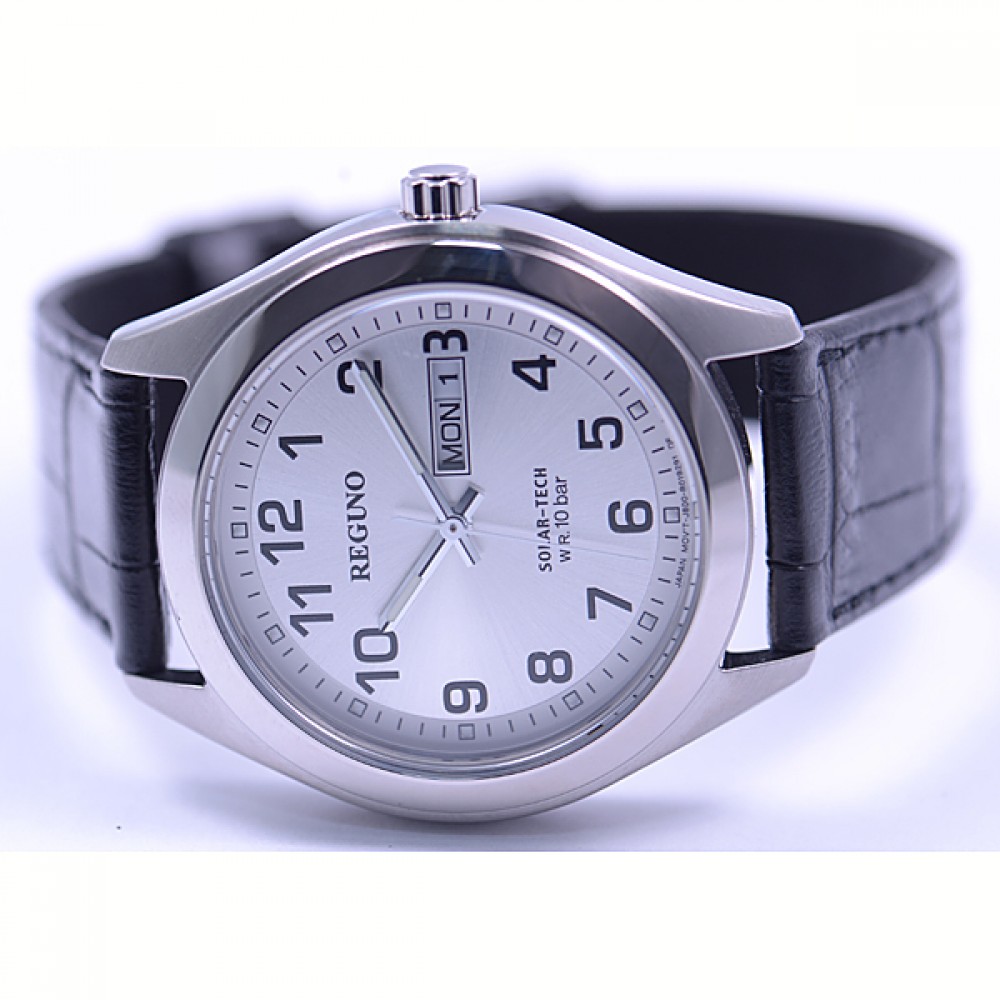 CITIZEN REGUNO KM1-016-10 - men's watch produced by Citizen. It is equipped with Japanese solar quartz movement and J800 calibre. Stainless steel case of round shape. Case dimensions are 40 mm. in diameter and 10 mm. in thickness. The dial of this Citizen watch is silver. Display type: analog. This timepiece has mineral glass. Leather band, band color: black. 100 m. water resistance. The watch is from Citizen Reguno collection. The following features are equipped: date, day, glowing hands, glowing markers.