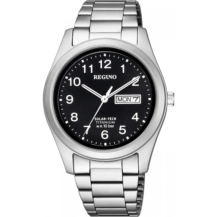 CITIZEN REGUNO KM1-415-53 - men's watch made by Citizen. It is equipped with Japanese solar quartz movement and J800 calibre. Titanium case of round shape. Case dimensions are 38 mm. in diameter and 9.6 mm. in thickness. The dial of this Citizen watch is black. Display type: analog. This timepiece has mineral glass. Titanium band, band color: silver. 100 m. water resistance. The watch is from Citizen Reguno collection. The following features are equipped: date, day.