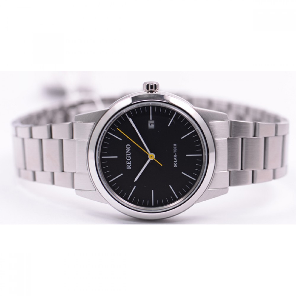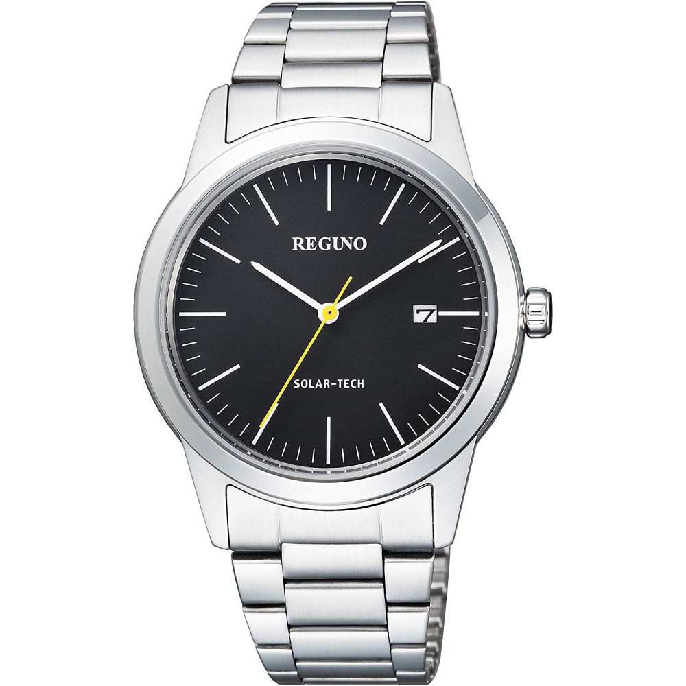 CITIZEN REGUNO KM3-116-53 - men's watch produced by Citizen. It has Japanese solar quartz movement and J810 calibre. Stainless steel case of round shape. Case dimensions are 38 mm. in diameter and 8.9 mm. in thickness. The dial of this Citizen watch is black. Display type: analog. This timepiece has mineral glass. Stainless steel band, band color: silver. 50 m. water resistance. The watch is from Citizen Reguno collection. The following features are equipped: date.