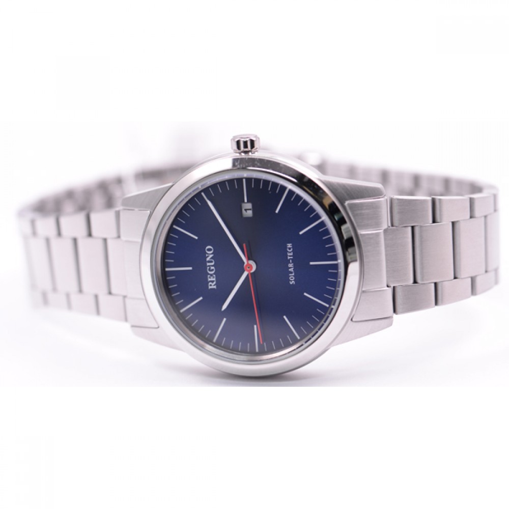 CITIZEN REGUNO KM3-116-71 - men's watch manufactured by Citizen. It has Japanese solar quartz movement and J810 calibre. Stainless steel case of round shape. Case dimensions are 38 mm. in diameter and 8.9 mm. in thickness. The dial of this Citizen watch is blue. Display type: analog. This timepiece has mineral glass. Stainless steel band, band color: silver. 50 m. water resistance. The watch is from Citizen Reguno collection. The following features are equipped: date.