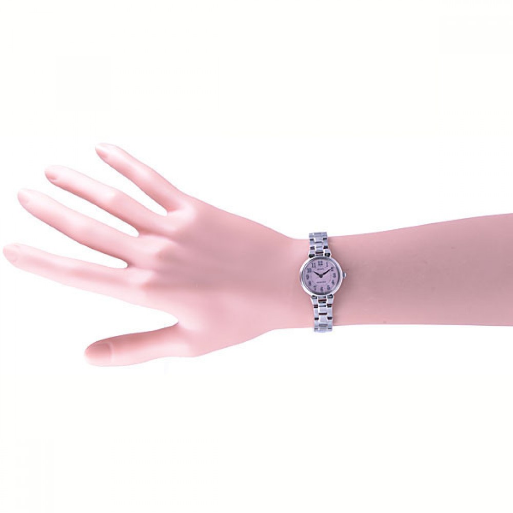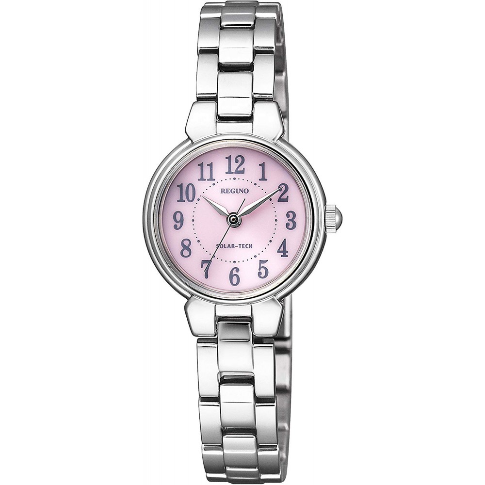 CITIZEN REGUNO KP1-012-95 - ladies watch produced by Citizen. It has Japanese solar quartz movement and E031 calibre. Stainless steel case of round shape. Case dimensions are 23.5 mm. in diameter and 6.6 mm. in thickness. The dial of this Citizen watch is pink. Display type: analog. This timepiece has mineral glass. Stainless steel band, band color: silver. 50 m. water resistance. The watch is from Citizen Reguno collection.