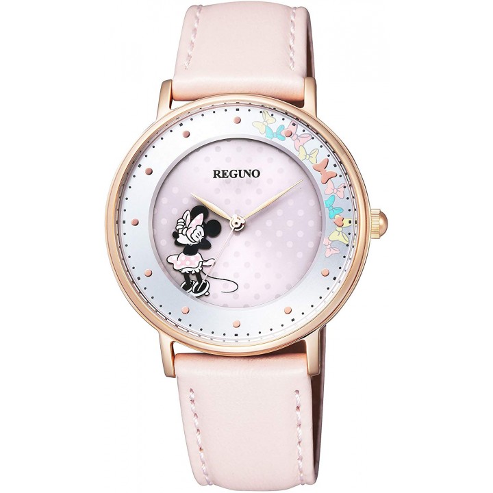 CITIZEN REGUNO KP3-163-10 - unisex watch produced by Citizen. It has Japanese solar quartz movement and E031 calibre. Stainless steel, gold plated case of round shape. Case dimensions are 36 mm. in diameter and 7.4 mm. in thickness. The dial of this Citizen watch is silver. Display type: analog. This timepiece has mineral glass. Leather band, band color: pink. 50 m. water resistance. The watch is from Citizen Reguno collection. The following features are equipped: limited edition.
