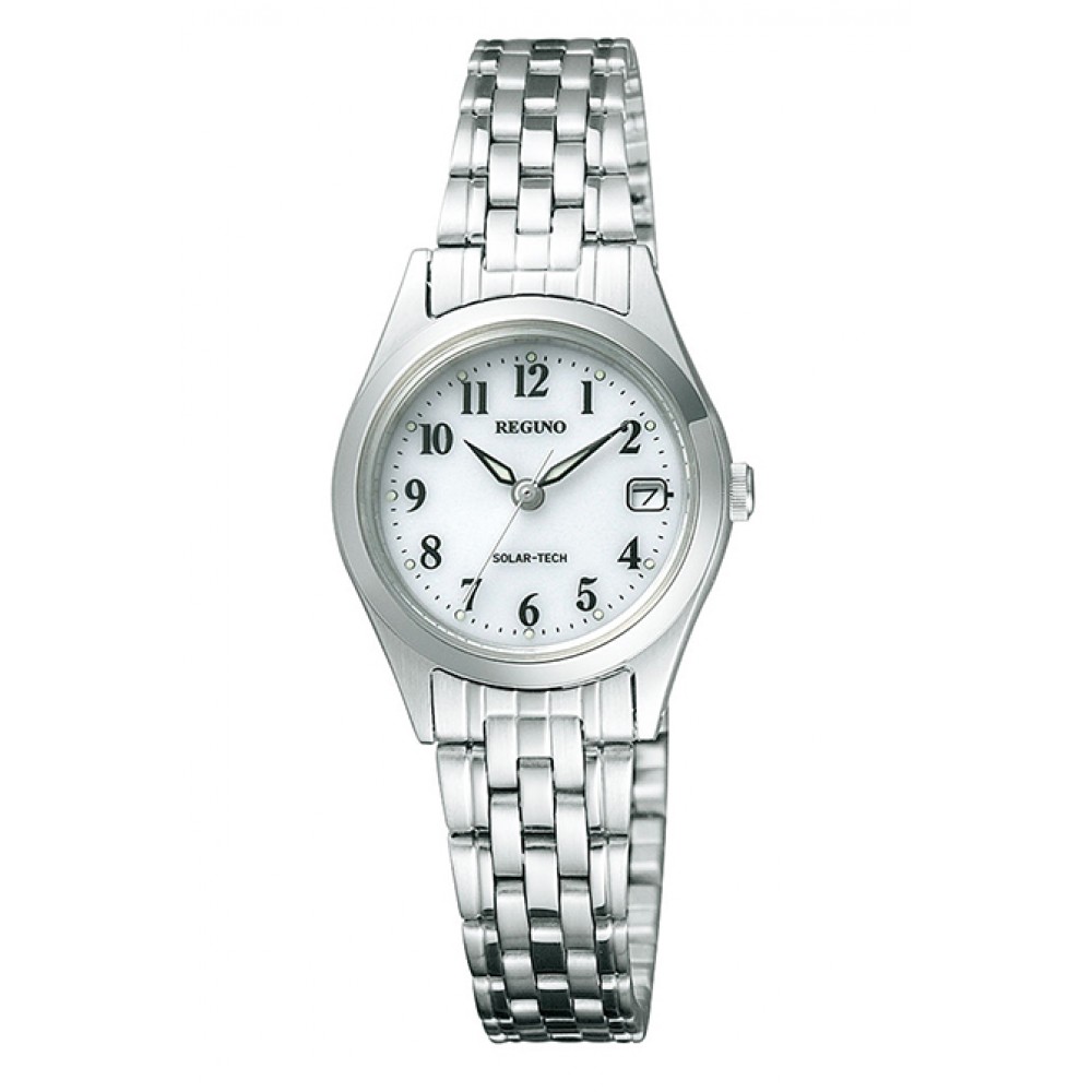 Citizen Reguno RS26-0051A - ladies watch manufactured by Citizen. It has Japanese solar quartz movement and E011 calibre. Stainless steel case of round shape. Case dimensions are 24 mm. in diameter and 7.8 mm. in thickness. The dial of this Citizen watch is white. Display type: analog. This timepiece has mineral glass. Stainless steel band, band color: silver. 50 m. water resistance. The watch is from Citizen Reguno collection. The following features are equipped: date, glowing markers, glowing hands.