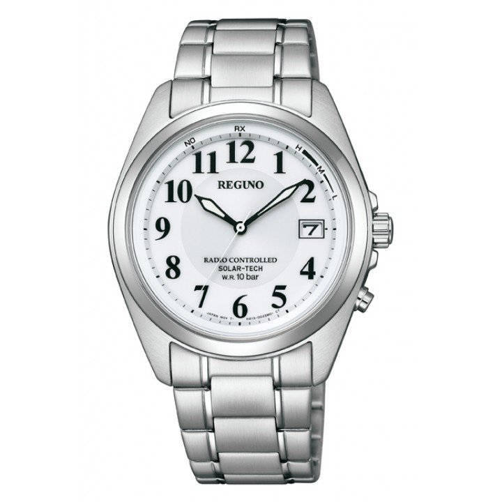 Citizen Reguno Solar-tech Radio Wave KS3-115-11 - men's watch produced by Citizen. It is equipped with Japanese solar quartz movement and H415 calibre. Stainless steel case of round shape. Case dimensions are 38 mm. in diameter and 9.2 mm. in thickness. The dial of this Citizen watch is white. Display type: analog. This timepiece has mineral glass. Stainless steel band, band color: silver. 100 m. water resistance. The watch is from Citizen Reguno collection. The following features are equipped: radio controlled, date, glowing hands, perpetual calendar, power reserve indicator.