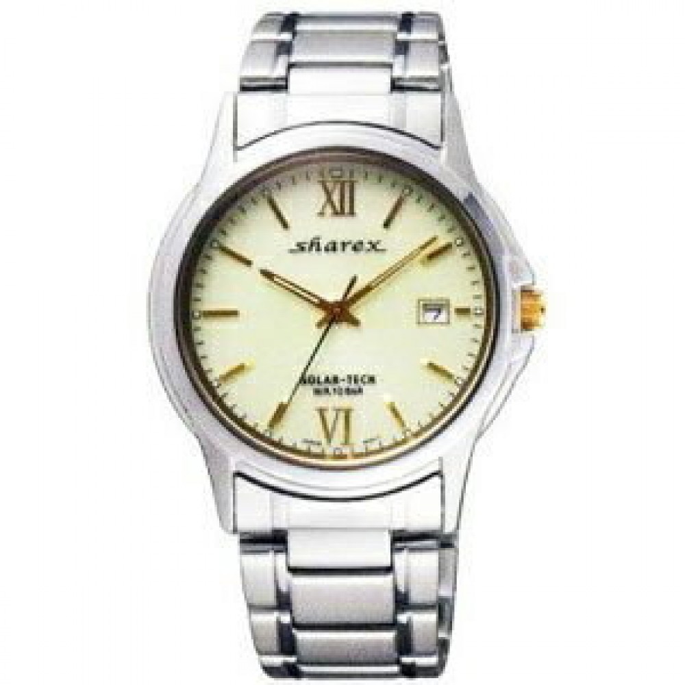 Citizen Sharex SXA30-0056 - men's watch manufactured by Citizen. It is equipped with Japanese solar quartz movement and EM11 calibre. Stainless steel case of round shape. Case dimensions are 36.5 mm. in diameter and 10.3 mm. in thickness. The dial of this Citizen watch is beige. Display type: analog. This timepiece has mineral glass. Stainless steel band, band color: silver. 100 m. water resistance. The watch is from Sharex collection. The following features are equipped: date, glowing hands, glowing markers.