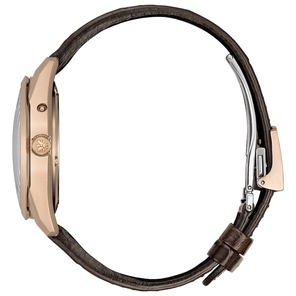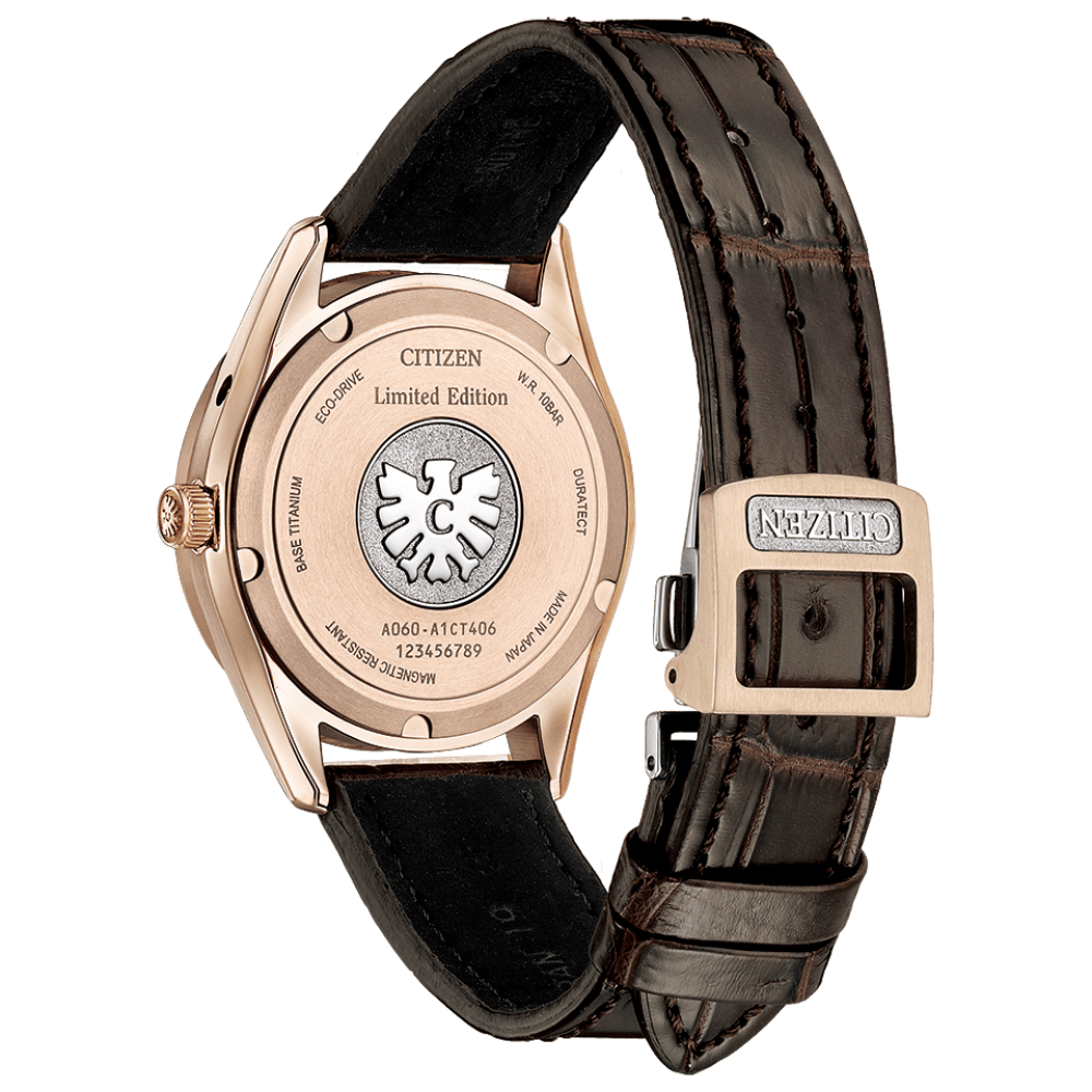 Citizen The Citizen Limited Edition AQ4106-00W - men's watch manufactured by Citizen. It is equipped with Japanese solar quartz movement and A060 calibre. Super titanium, duratect sakura pink case of round shape. Case dimensions are 38.3 mm. in diameter and 12.2 mm. in thickness. The dial of this Citizen watch is brown. Display type: analog. This timepiece has sapphire, clarity coating glass. Crocodile band, band color: brown. 100 m. water resistance. The watch is from The Citizen collection. The following features are equipped: antimagnetic, date, power reserve indicator, perpetual calendar, limited edition.