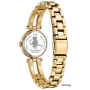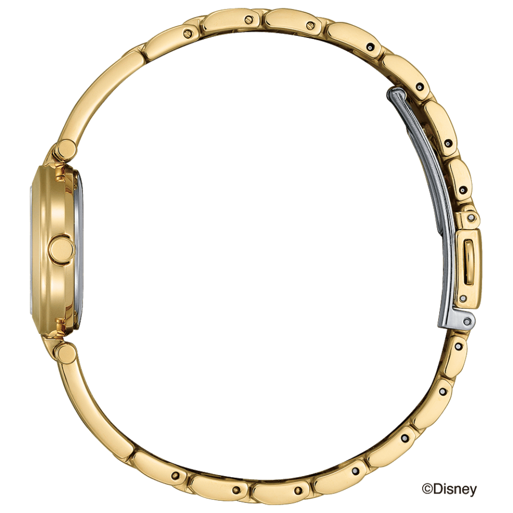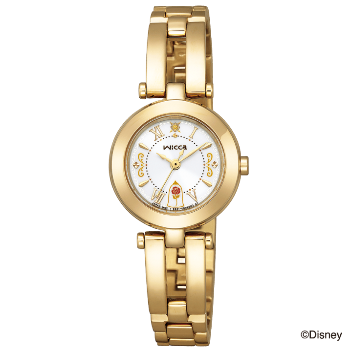 Citizen Wicca Beauty and the Beast Limited Edition KP5-221-13 - ladies watch made by Citizen. It is equipped with Japanese solar quartz movement and E031 calibre. Stainless steel, gold plated case of round shape. Case dimensions are 24 mm. in diameter and 6.8 mm. in thickness. The dial of this Citizen watch is silver. Display type: analog. This timepiece has mineral glass. Stainless steel, gold plated band, band color: gold. 50 m. water resistance. The watch is from Wicca collection. The following features are equipped: crystal set, limited edition.