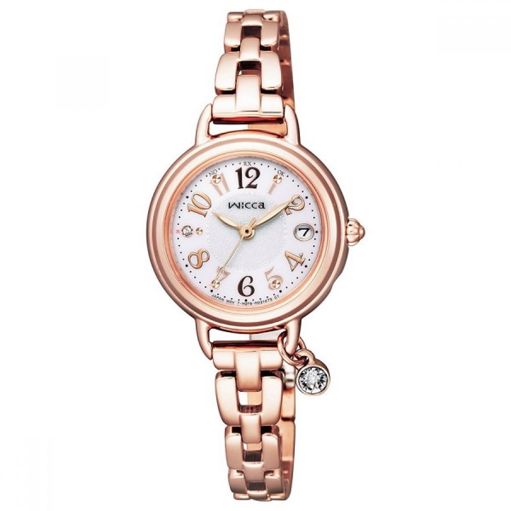 Citizen Wicca Breath Line KL0-561-17 - ladies watch produced by Citizen. It is equipped with Japanese solar quartz movement and H0F6 calibre. Stainless steel, gold plated case of round shape. Case dimensions are 25.5 mm. in diameter and 7.2 mm. in thickness. The dial of this Citizen watch is white. Display type: analog. This timepiece has mineral glass. Stainless steel, gold plated, satin band, band color: gold, beige. 50 m. water resistance. The watch is from Wicca collection. The following features are equipped: crystal set, date, radio controlled, power reserve indicator, perpetual calendar, antimagnetic.
