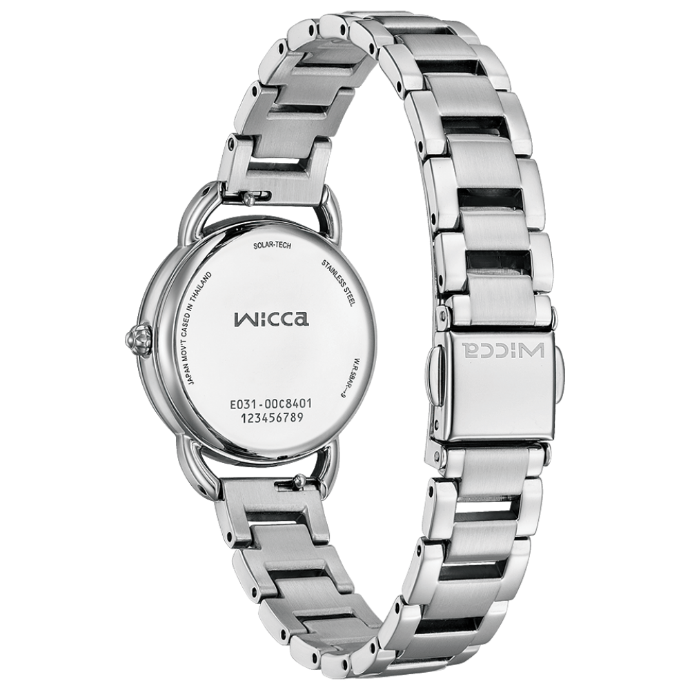 Citizen Wicca Collection KP6-014-11 - ladies watch manufactured by Citizen. It is equipped with Japanese solar quartz movement and E031 calibre. Stainless steel case of round shape. Case dimensions are 28 mm. in diameter and 7.9 mm. in thickness. The dial of this Citizen watch is silver. Display type: analog. This timepiece has mineral glass. Stainless steel, synthetic leather (ecopet®) band, band color: silver, white. 50 m. water resistance. The watch is from Wicca collection. The following features are equipped: glowing hands, crystal set.
