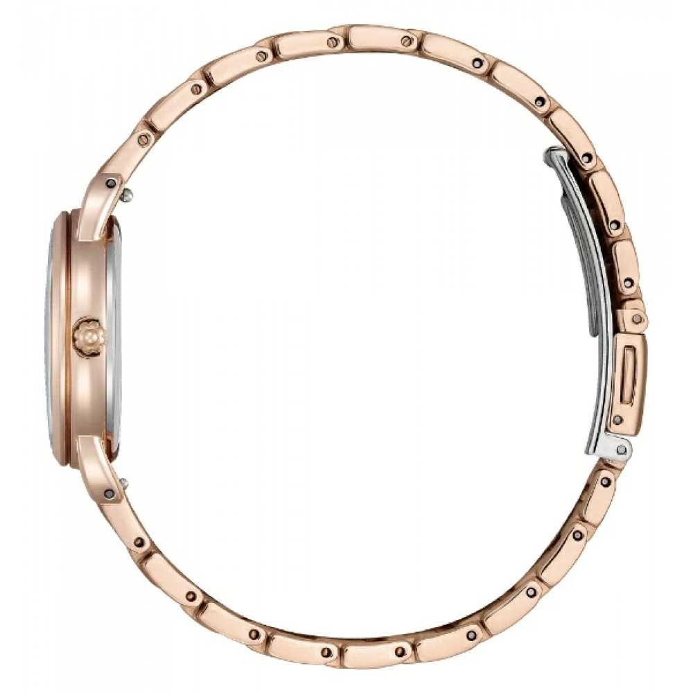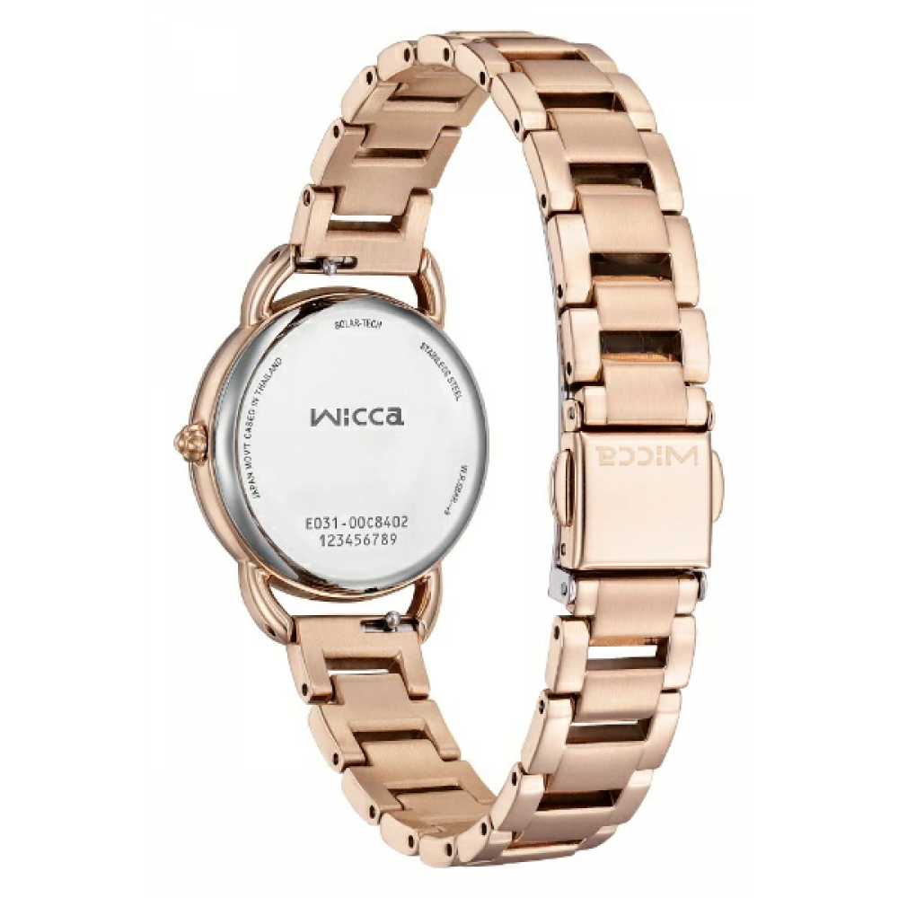 Citizen Wicca Collection KP6-065-11 - ladies watch manufactured by Citizen. It has Japanese solar quartz movement and E031 calibre. Stainless steel, gold plated case of round shape. Case dimensions are 28 mm. in diameter and 7.9 mm. in thickness. The dial of this Citizen watch is silver. Display type: analog. This timepiece has mineral glass. Stainless steel, gold plated, synthetic leather (ecopet®) band, band color: gold, light pink. 50 m. water resistance. The watch is from Wicca collection. The following features are equipped: glowing hands, crystal set.
