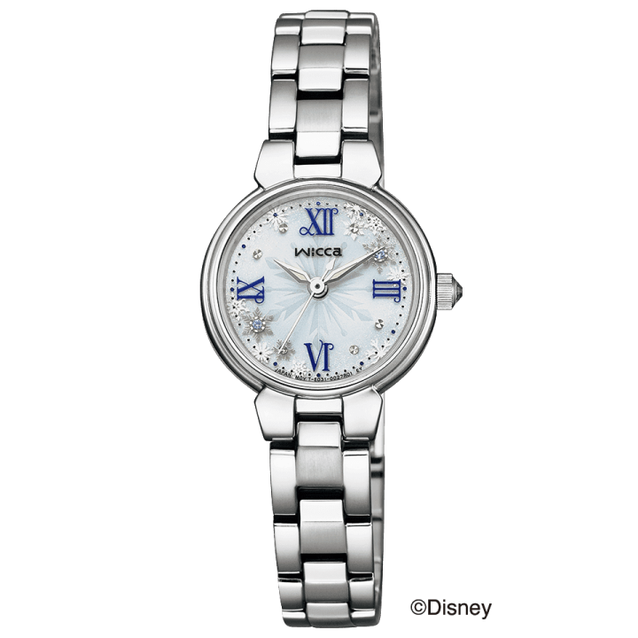 Citizen Wicca Disney Collection "Frozen" Limited Model KP2-116-91 - ladies watch manufactured by Citizen. It is equipped with Japanese solar quartz movement and E031 calibre. Stainless steel case of round shape. Case dimensions are 23.5 mm. in diameter and 6.6 mm. in thickness. The dial of this Citizen watch is light blue. Display type: analog. This timepiece has mineral glass. Stainless steel band, band color: silver. 50 m. water resistance. The watch is from Wicca collection. The following features are equipped: crystal set, limited edition.