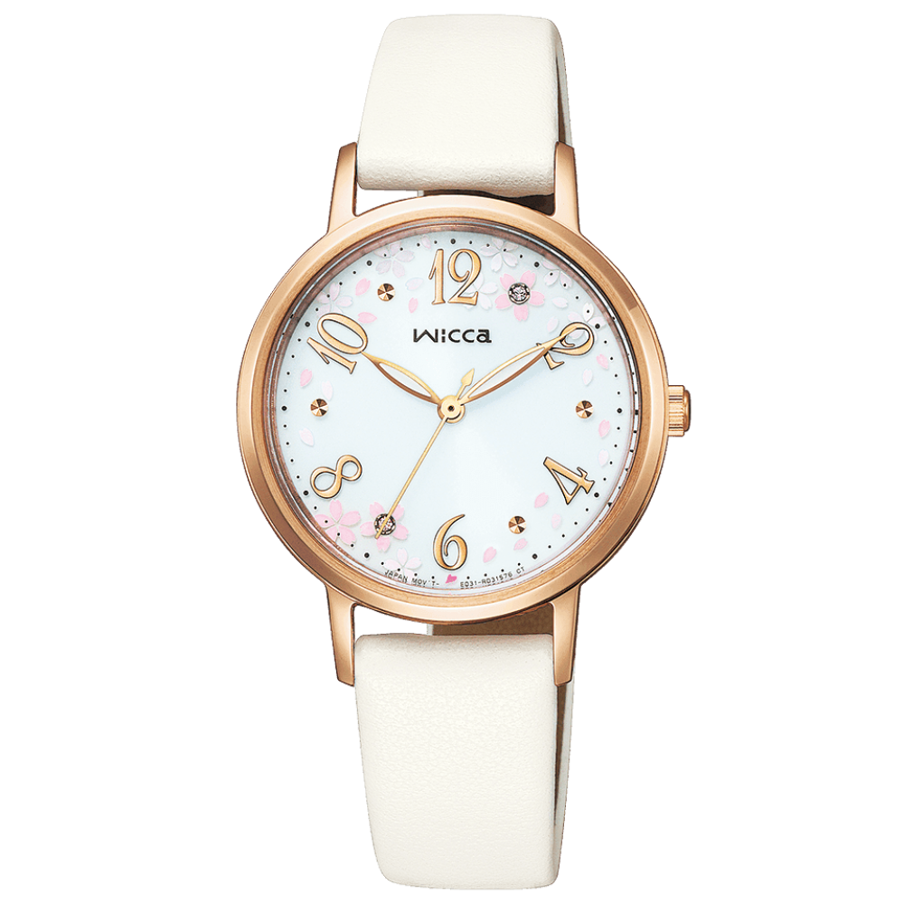Citizen Wicca Haruka Fukuhara Collaboration Model KP5-166-12 - ladies watch made by Citizen. It has Japanese solar quartz movement and E031 calibre. Stainless steel, gold plated case of round shape. Case dimensions are 30.2 mm. in diameter and 7.5 mm. in thickness. The dial of this Citizen watch is white. Display type: analog. This timepiece has mineral glass. Leather band, band color: pink, white. 50 m. water resistance. The watch is from Wicca collection. The following features are equipped: crystal set.