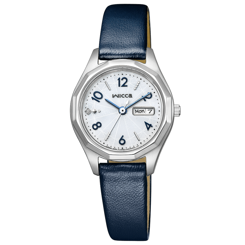 Citizen Wicca KH3-517-10 - ladies watch manufactured by Citizen. It has Japanese solar quartz movement and E001 calibre. Stainless steel case of round shape. Case dimensions are 26.5 mm. in diameter and 8.3 mm. in thickness. The dial of this Citizen watch is white. Display type: analog. This timepiece has mineral glass. Synthetic leather (ecopet®) band, band color: navy. 100 m. water resistance. The watch is from Wicca collection. The following features are equipped: crystal set, date, day.