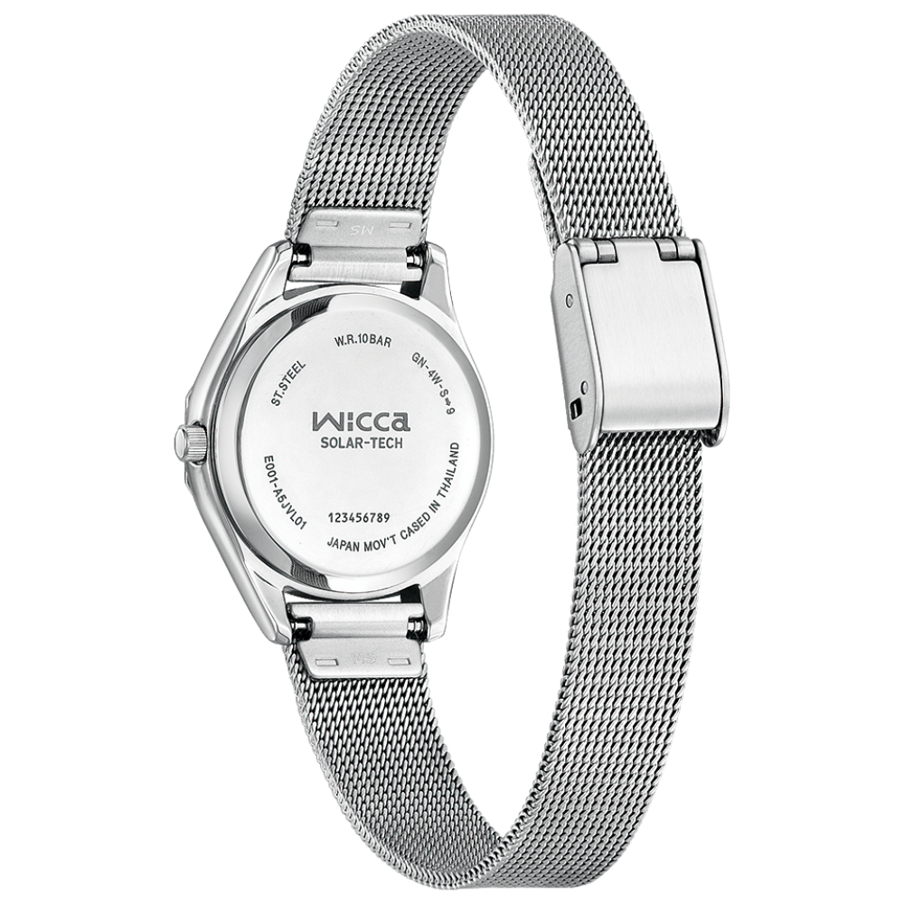 Citizen Wicca KH3-517-11 - ladies watch produced by Citizen. It has Japanese solar quartz movement and E001 calibre. Stainless steel case of round shape. Case dimensions are 26.5 mm. in diameter and 8.3 mm. in thickness. The dial of this Citizen watch is white. Display type: analog. This timepiece has mineral glass. Stainless steel band, band color: silver. 100 m. water resistance. The watch is from Wicca collection. The following features are equipped: crystal set, date, day.