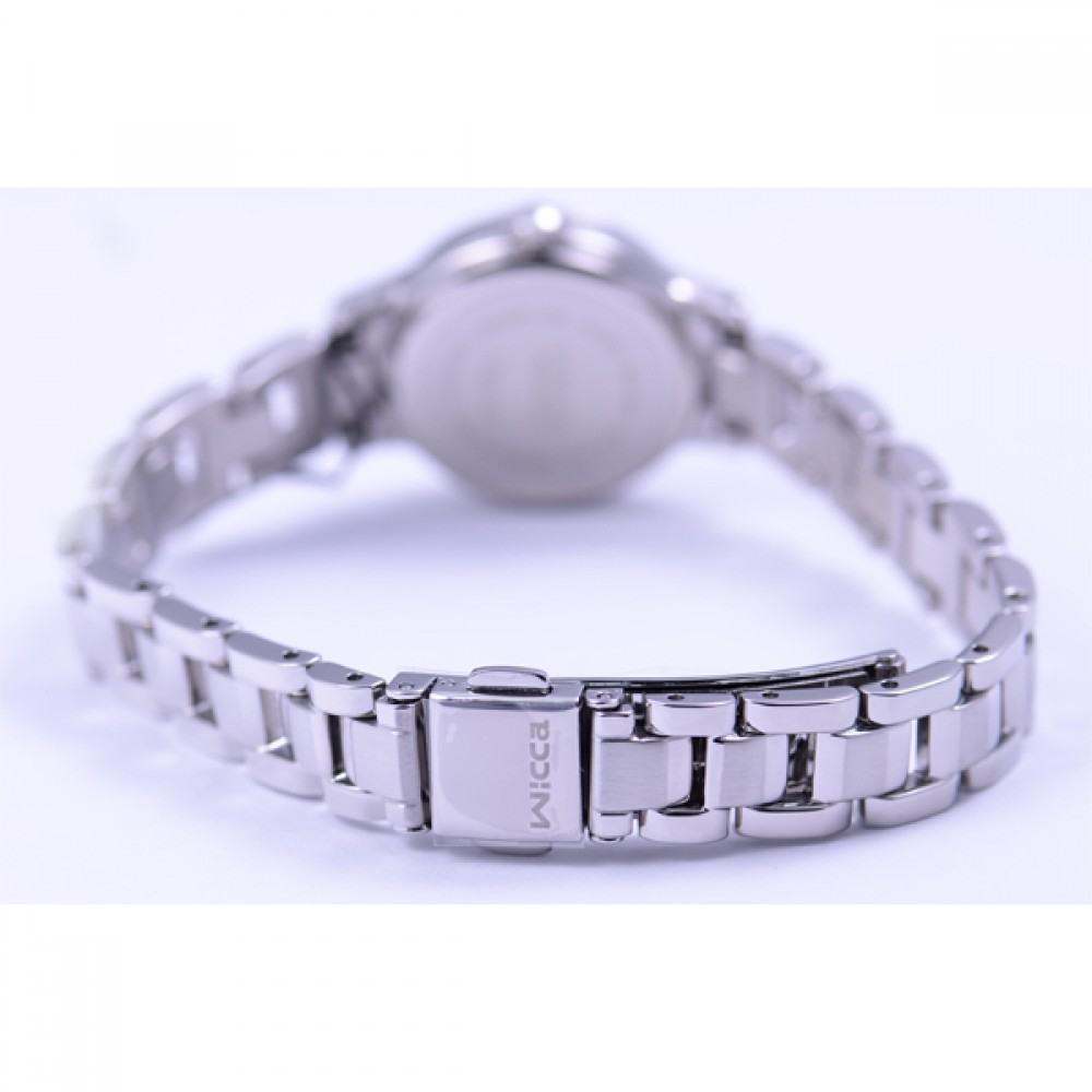 CITIZEN WICCA KH4-912-11 - ladies watch manufactured by Citizen. It is equipped with Japanese solar quartz movement and E011 calibre. Stainless steel case of round shape. Case dimensions are 24 mm. in diameter and 7.2 mm. in thickness. The dial of this Citizen watch is white. Display type: analog. This timepiece has mineral glass. Stainless steel band, band color: silver. 50 m. water resistance. The watch is from Wicca collection. The following features are equipped: date.