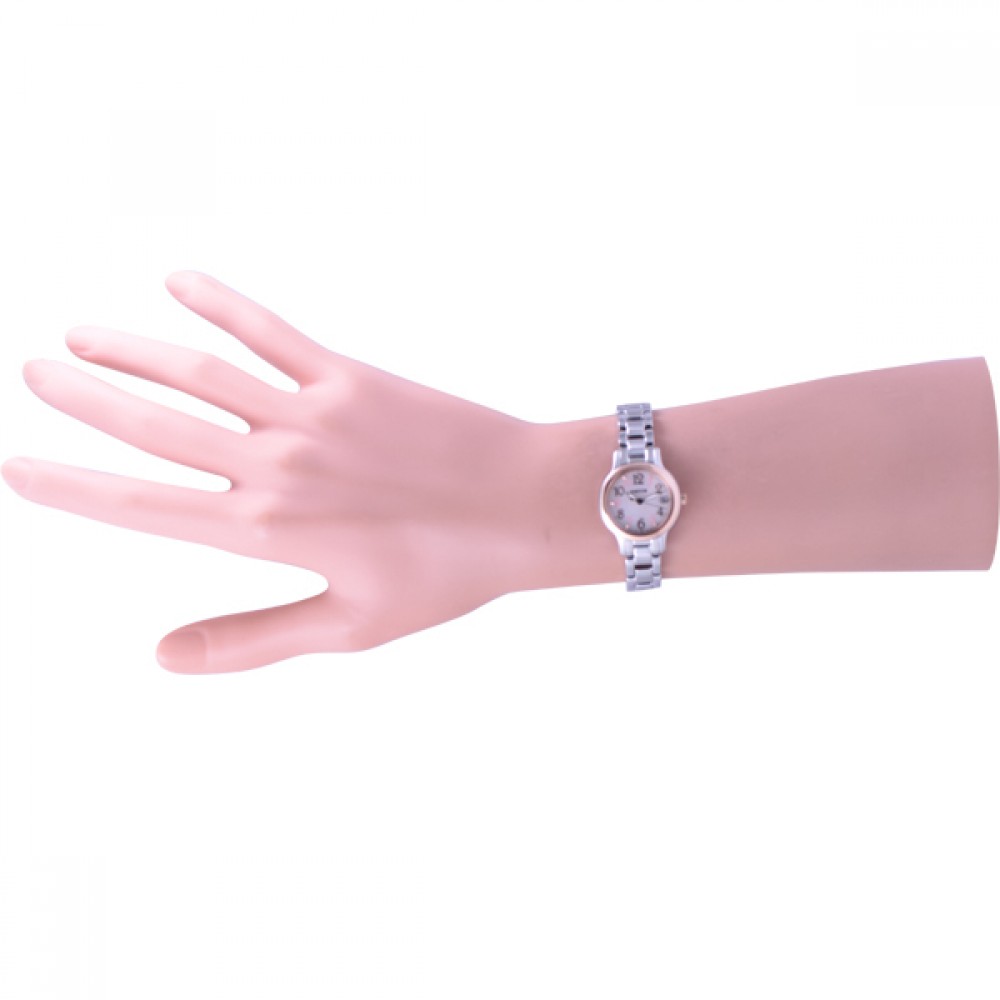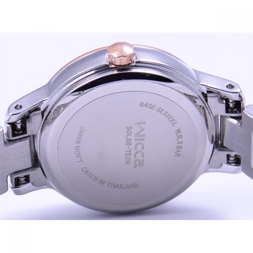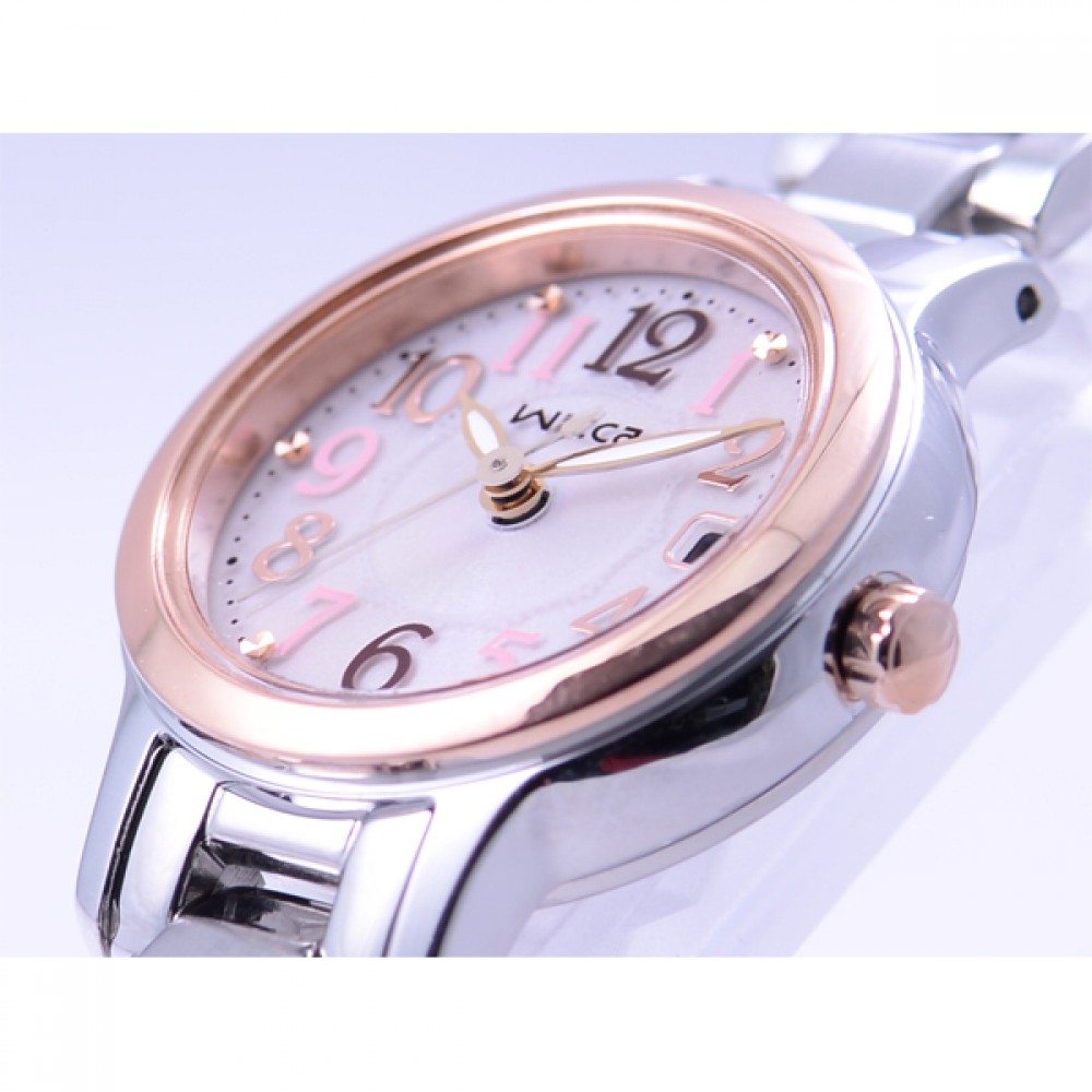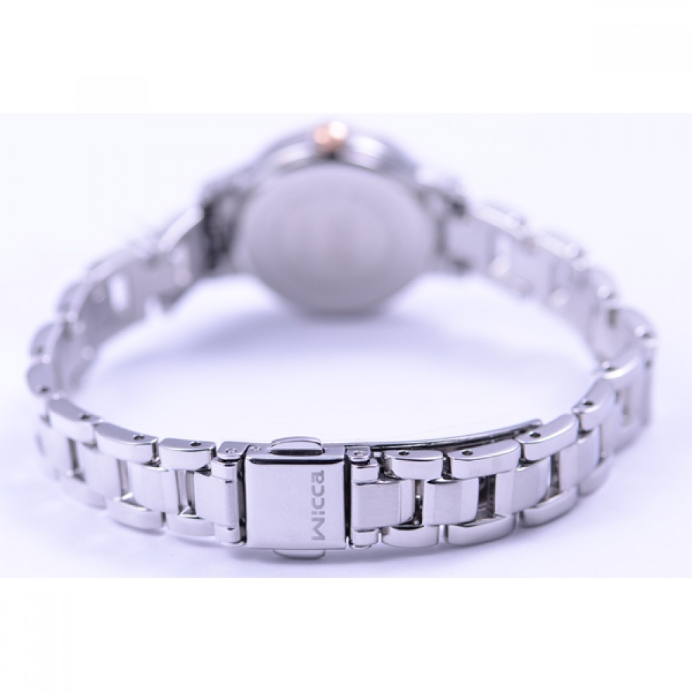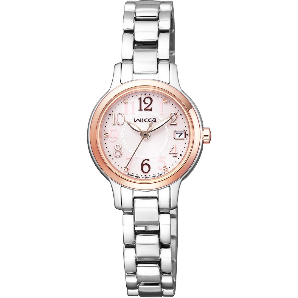 CITIZEN WICCA KH4-939-91 - ladies watch produced by Citizen. It is equipped with Japanese solar quartz movement and E011 calibre. Stainless steel, gold plated case of round shape. Case dimensions are 24 mm. in diameter and 7.2 mm. in thickness. The dial of this Citizen watch is pink. Display type: analog. This timepiece has mineral glass. Stainless steel band, band color: silver. 50 m. water resistance. The watch is from Wicca collection. The following features are equipped: date.