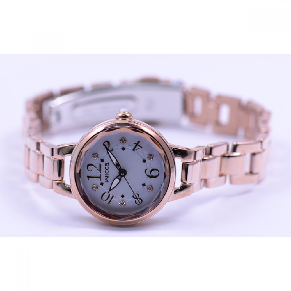 CITIZEN WICCA KH8-527-11 - ladies watch manufactured by Citizen. It has Japanese solar quartz movement and E031 calibre. Stainless steel, gold plated case of round shape. Case dimensions are 24 mm. in diameter and 7.5 mm. in thickness. The dial of this Citizen watch is white, blue. Display type: analog. This timepiece has mineral glass. Stainless steel, gold plated band, band color: gold. 50 m. water resistance. The watch is from Wicca collection. The following features are equipped: crystal set, glowing hands.