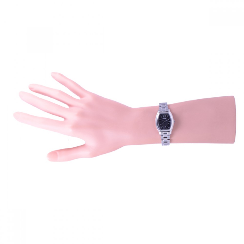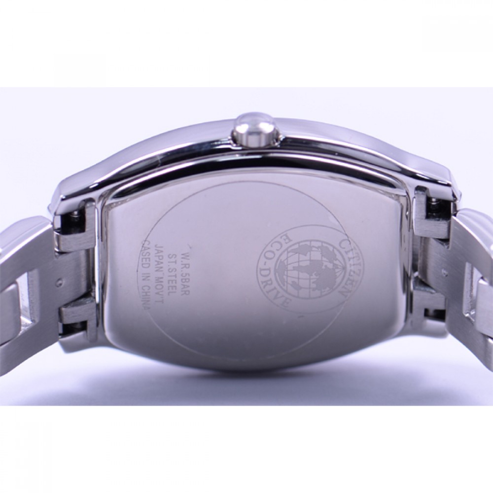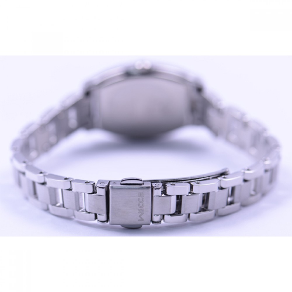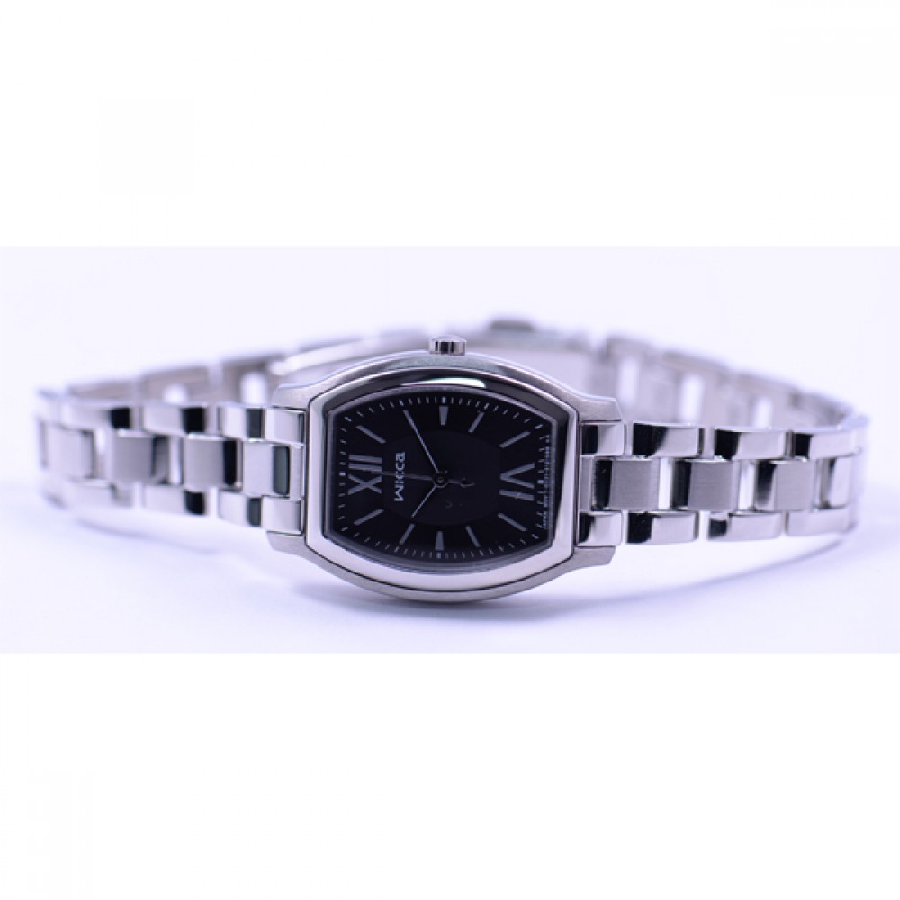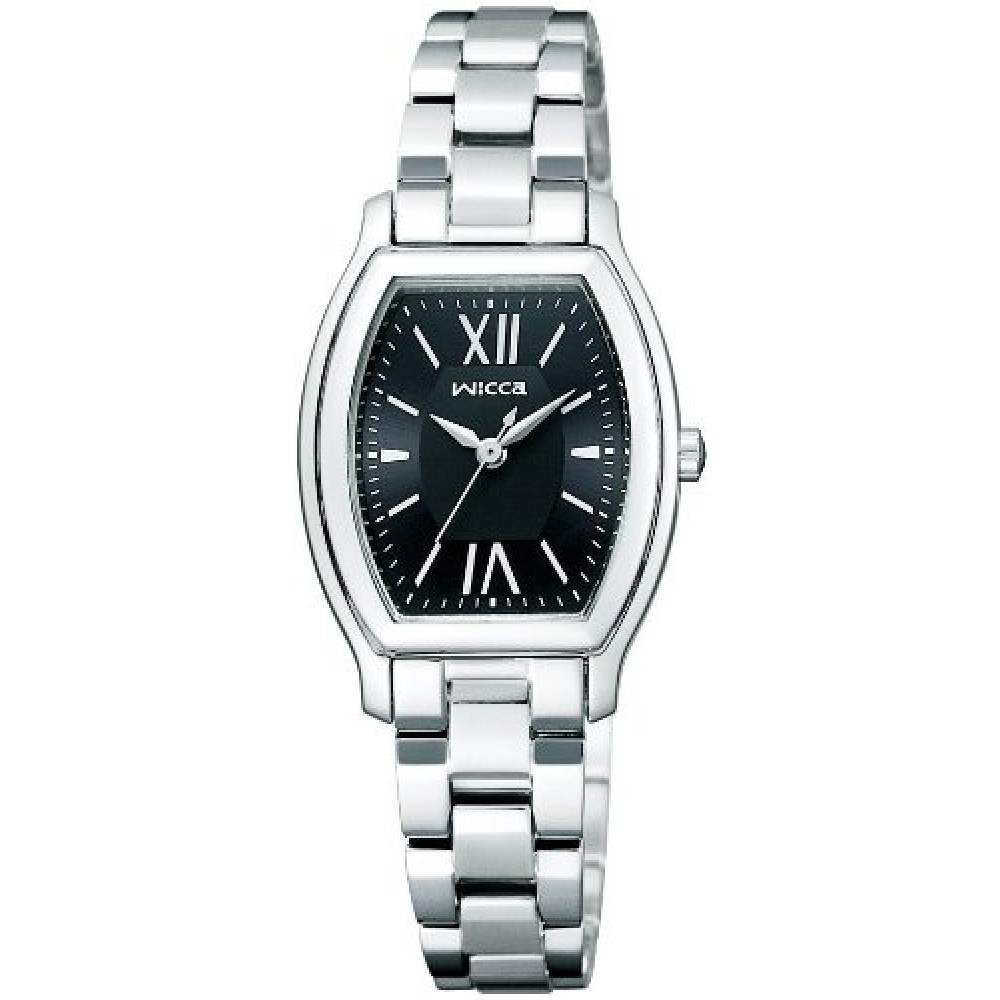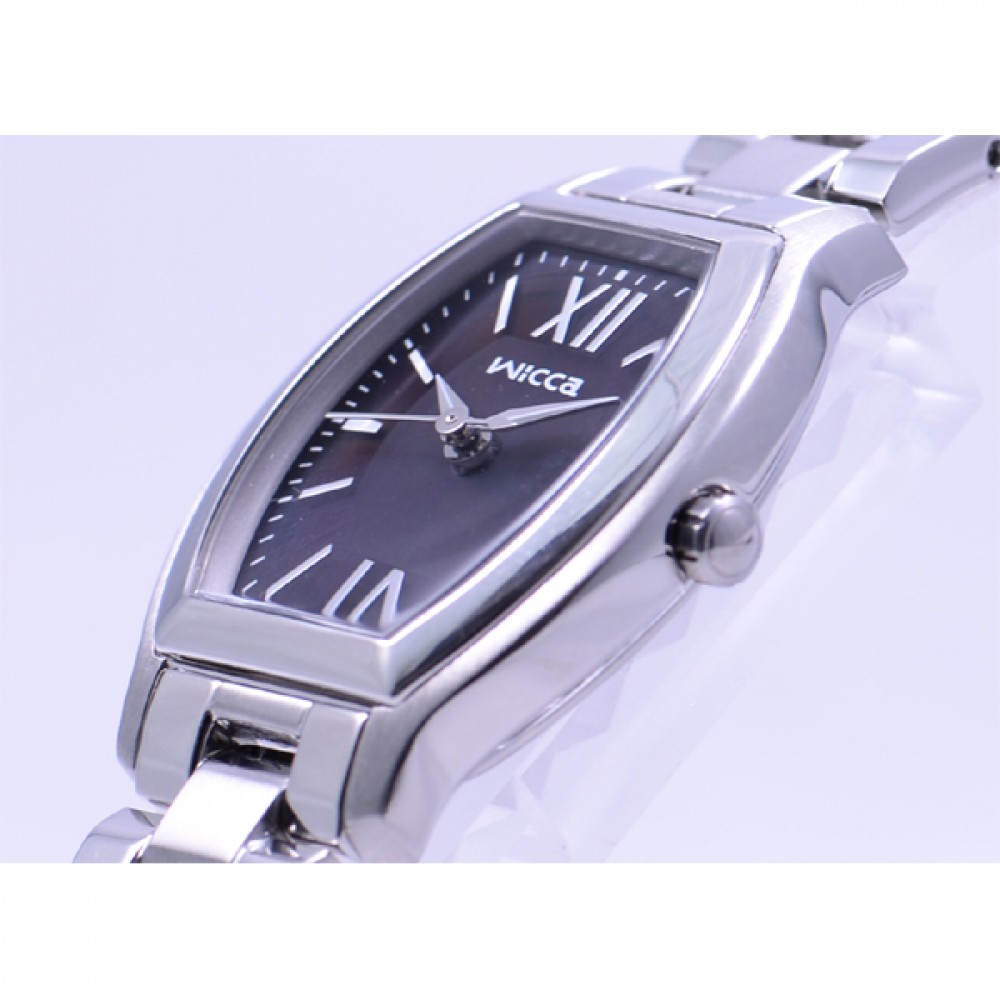 CITIZEN WICCA KH8-713-51 - ladies watch made by Citizen. It has Japanese solar quartz movement and E031 calibre. Stainless steel case of tonneau shape. Case dimensions are 24 mm. in diameter and 7.4 mm. in thickness. The dial of this Citizen watch is black. Display type: analog. This timepiece has mineral glass. Stainless steel band, band color: silver. 50 m. water resistance. The watch is from Wicca collection.