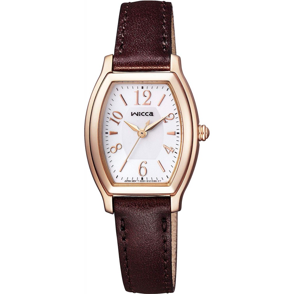CITIZEN WICCA KH8-721-12 - ladies watch produced by Citizen. It has Japanese solar quartz movement and E031 calibre. Stainless steel, gold plated case of tonneau shape. Case dimensions are 24 mm. in diameter and 7.6 mm. in thickness. The dial of this Citizen watch is white. Display type: analog. This timepiece has mineral glass. Leather band, band color: brown. 50 m. water resistance. The watch is from Wicca collection.