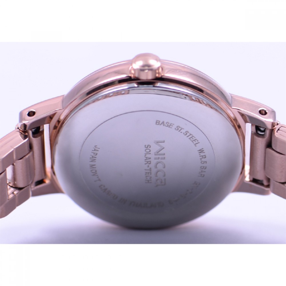 CITIZEN WICCA KH9-965-91 - ladies watch manufactured by Citizen. It is equipped with Japanese solar quartz movement and E031 calibre. Stainless steel, gold plated case of round shape. Case dimensions are 24 mm. in diameter and 7.1 mm. in thickness. The dial of this Citizen watch is pink. Display type: analog. This timepiece has mineral glass. Stainless steel, gold plated band, band color: gold. 50 m. water resistance. The watch is from Wicca collection.