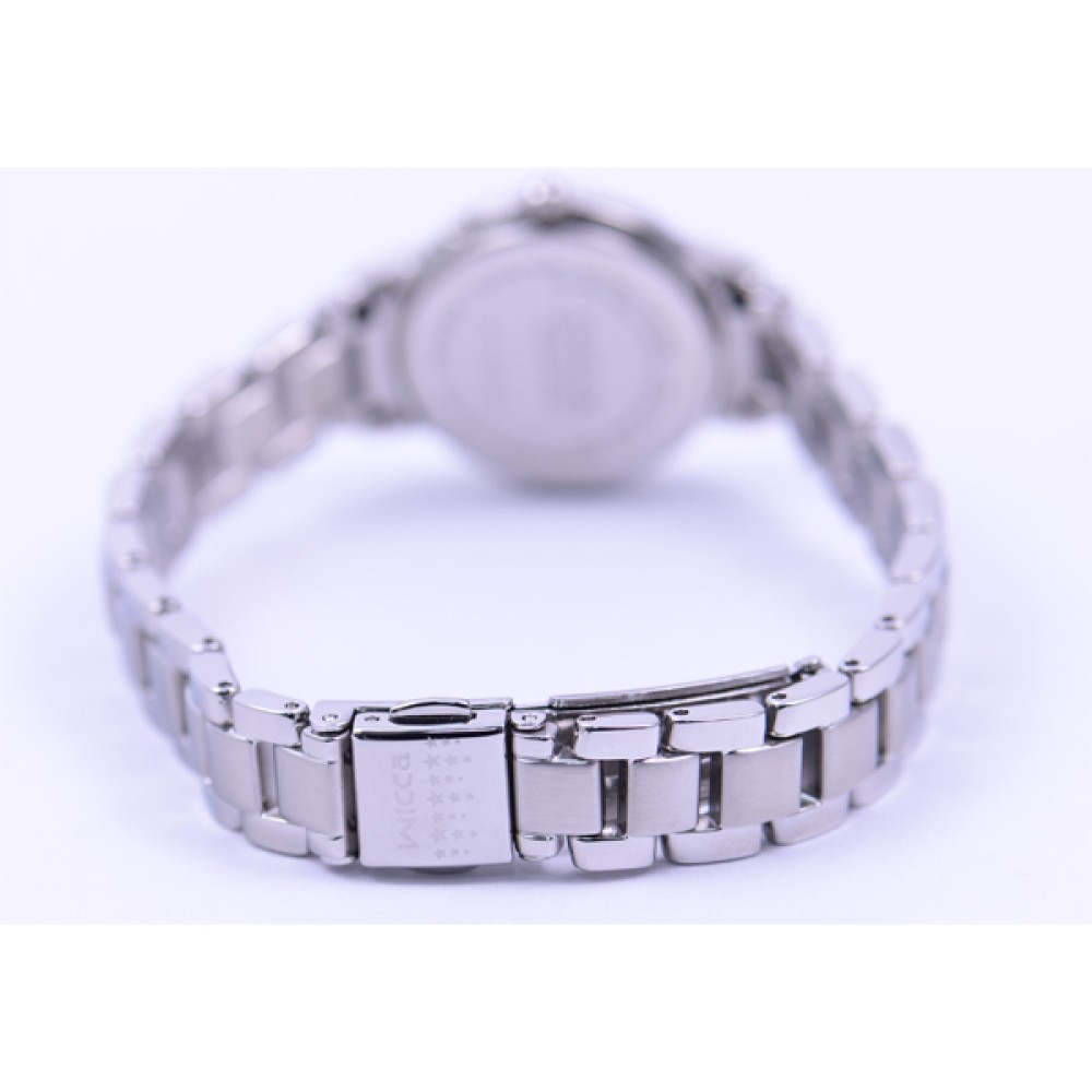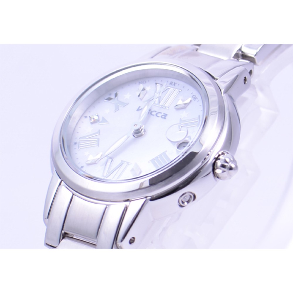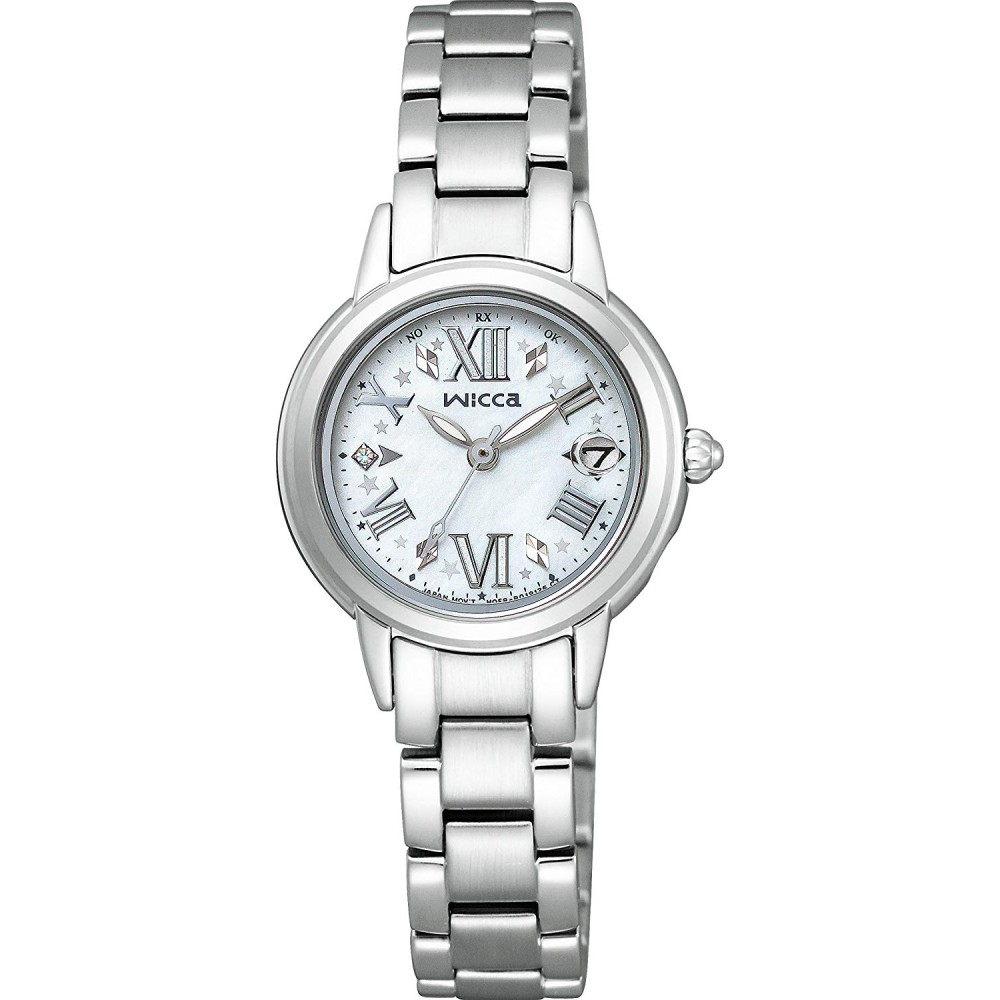 CITIZEN WICCA KL0-014-97 - ladies watch produced by Citizen. It is equipped with Japanese solar quartz movement and H0F8 calibre. Stainless steel case of round shape. Case dimensions are 25.5 mm. in diameter and 7.23 mm. in thickness. The dial of this Citizen watch is white. Display type: analog. This timepiece has mineral glass. Stainless steel band, band color: silver. 50 m. water resistance. The watch is from Wicca collection. The following features are equipped: radio controlled, date, perpetual calendar, crystal set, limited edition, antimagnetic.
