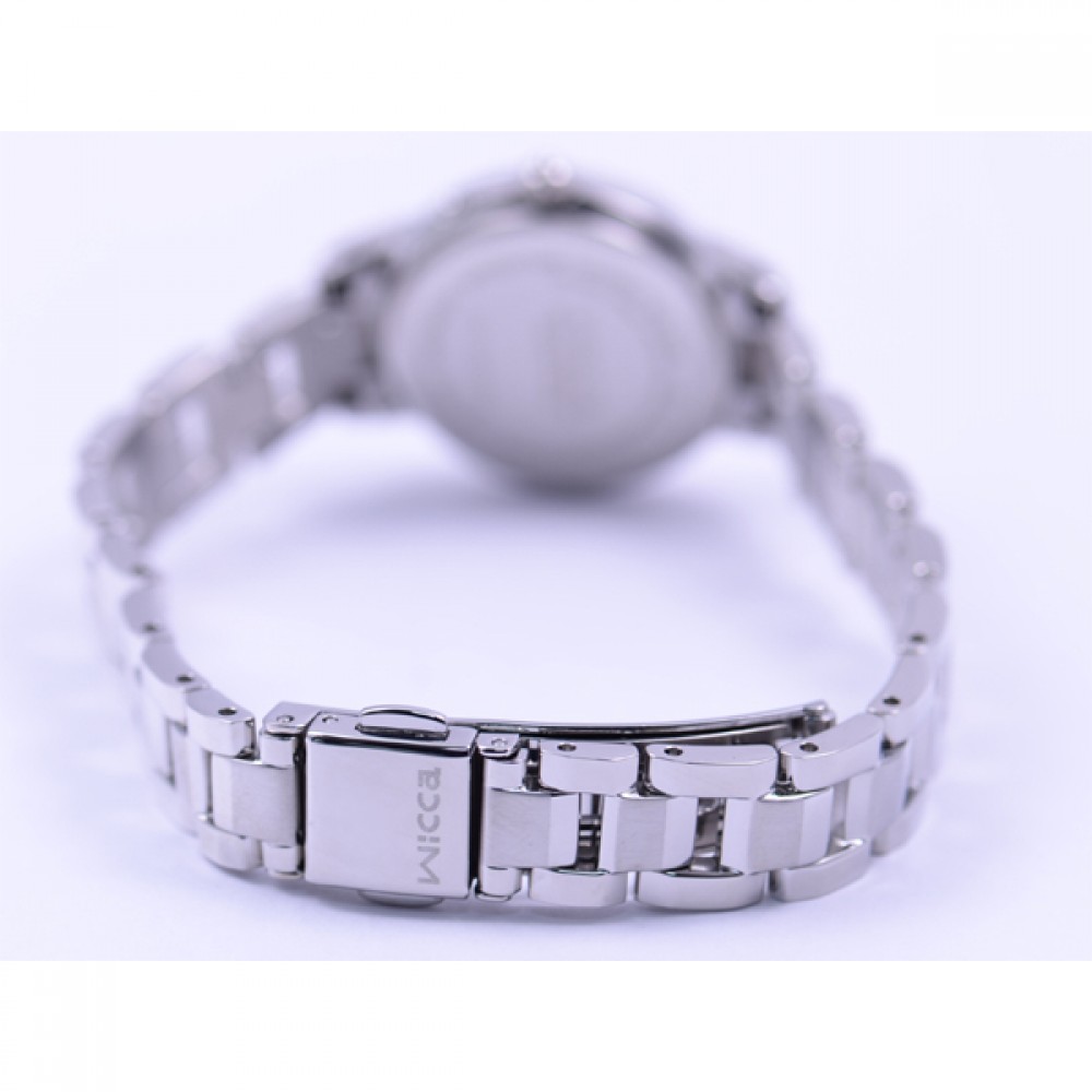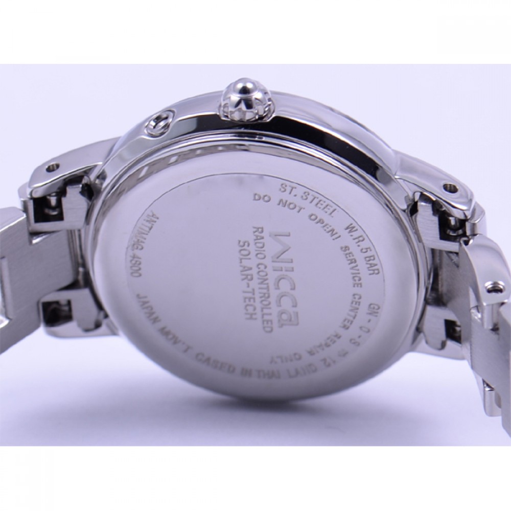 CITIZEN WICCA KL0-413-11 - ladies watch produced by Citizen. It is equipped with Japanese solar quartz movement and H0F8 calibre. Stainless steel case of round shape. Case dimensions are 25.5 mm. in diameter and 7.2 mm. in thickness. The dial of this Citizen watch is white. Display type: analog. This timepiece has mineral glass. Stainless steel band, band color: silver. 50 m. water resistance. The watch is from Wicca collection. The following features are equipped: antimagnetic, date, perpetual calendar, radio controlled.
