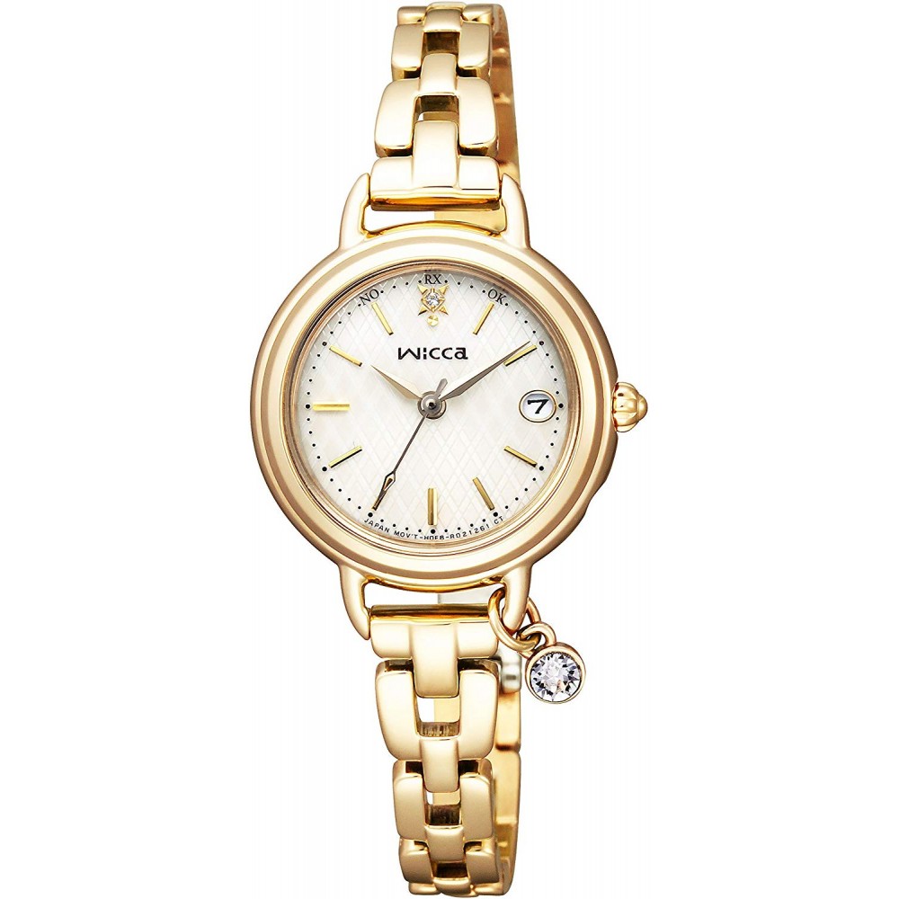 CITIZEN WICCA KL0-511-91 - ladies watch made by Citizen. It is equipped with Japanese solar quartz movement and H0F8 calibre. Stainless steel, gold plated case of round shape. Case dimensions are 25.5 mm. in diameter and 7.2 mm. in thickness. The dial of this Citizen watch is beige. Display type: analog. This timepiece has mineral glass. Stainless steel, gold plated band, band color: gold. 50 m. water resistance. The watch is from Wicca collection. The following features are equipped: antimagnetic, date, crystal set, perpetual calendar, radio controlled.