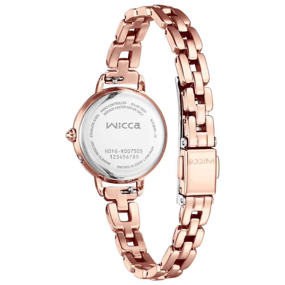 Citizen Wicca KL0-561-21 - ladies watch manufactured by Citizen. It is equipped with Japanese solar quartz movement and H0F6 calibre. Stainless steel, gold plated case of round shape. Case dimensions are 25.5 mm. in diameter and 7.2 mm. in thickness. The dial of this Citizen watch is mother of pearl. Display type: analog. This timepiece has mineral glass. Stainless steel, gold plated band, band color: gold. 50 m. water resistance. The watch is from Wicca collection. The following features are equipped: antimagnetic, crystal set, power reserve indicator, radio controlled, perpetual calendar, date.