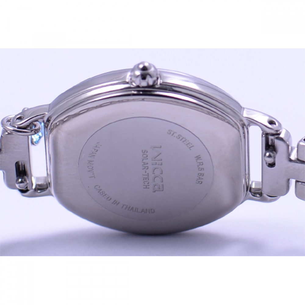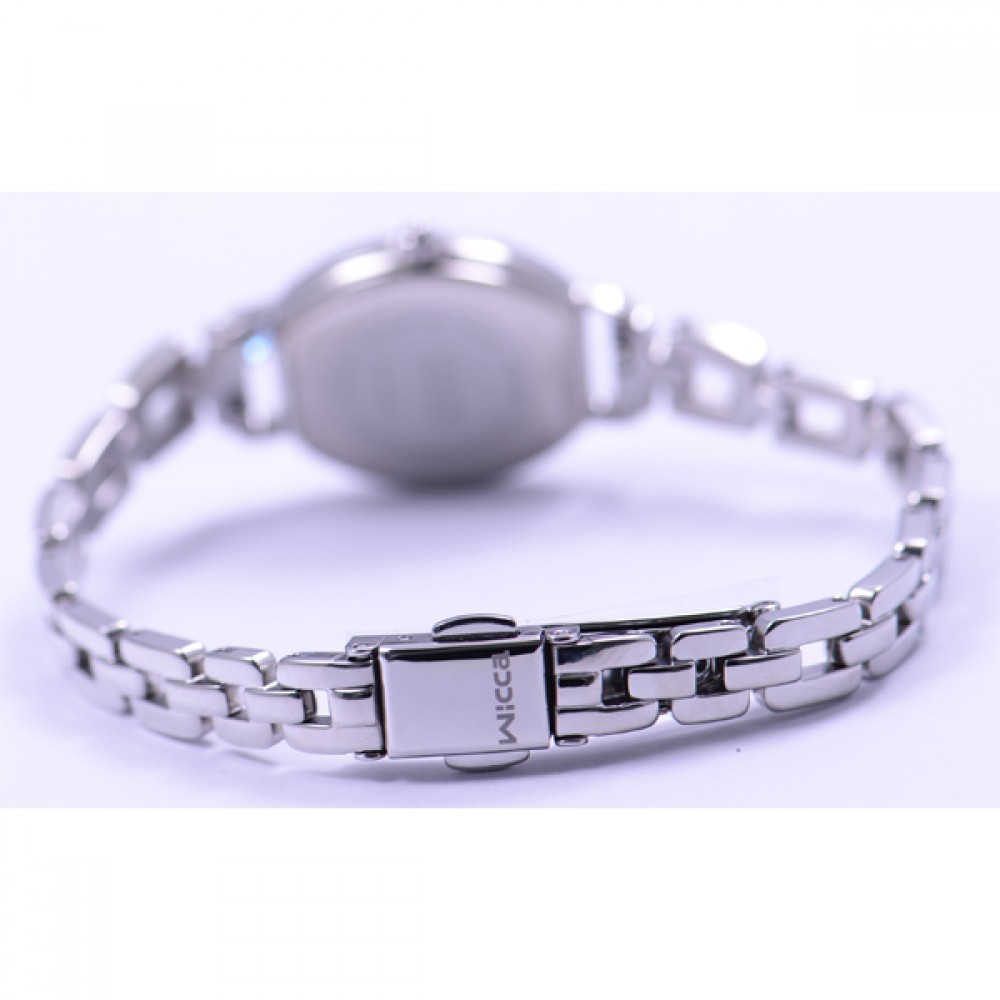 CITIZEN WICCA KP2-515-11 - ladies watch made by Citizen. It has Japanese solar quartz movement and E031 calibre. Stainless steel case of tonneau shape. Case dimensions are 23.5 mm. in diameter and 6.7 mm. in thickness. The dial of this Citizen watch is silver, white. Display type: analog. This timepiece has mineral glass. Stainless steel band, band color: silver. 50 m. water resistance. The watch is from Wicca collection. The following features are equipped: crystal set.