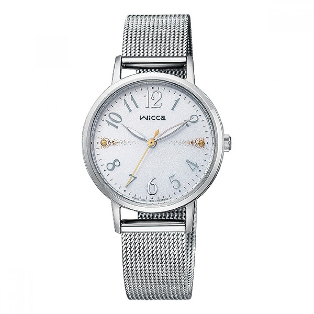 Citizen Wicca KP5-115-11 - ladies watch produced by Citizen. It is equipped with Japanese solar quartz movement and E031 calibre. Stainless steel case of round shape. Case dimensions are 30.2 mm. in diameter and 7.5 mm. in thickness. The dial of this Citizen watch is silver. Display type: analog. This timepiece has mineral glass. Stainless steel band, band color: silver. 50 m. water resistance. The watch is from Wicca collection. The following features are equipped: crystal set, glowing hands.