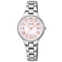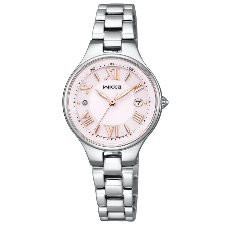 Citizen Wicca KS1-813-91 - ladies watch made by Citizen. It is equipped with Japanese solar quartz movement and H0F6 calibre. Stainless steel case of round shape. Case dimensions are 28 mm. in diameter and 8.6 mm. in thickness. The dial of this Citizen watch is pink. Display type: analog. This timepiece has mineral glass. Stainless steel band, band color: silver. 50 m. water resistance. The watch is from Wicca collection. The following features are equipped: radio controlled, date, crystal set, power reserve indicator, perpetual calendar.
