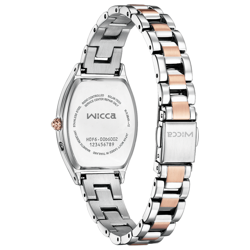 Citizen Wicca KS4-031-11 - ladies watch manufactured by Citizen. It has Japanese solar quartz movement and H0F6 calibre. Stainless steel, gold plated case of tonneau shape. Case dimensions are 25 mm. in diameter and 7.8 mm. in thickness. The dial of this Citizen watch is silver. Display type: analog. This timepiece has mineral glass. Stainless steel, gold plated band, band color: gold, silver. 50 m. water resistance. The watch is from Wicca collection. The following features are equipped: radio controlled, antimagnetic, crystal set, power reserve indicator, perpetual calendar, date.