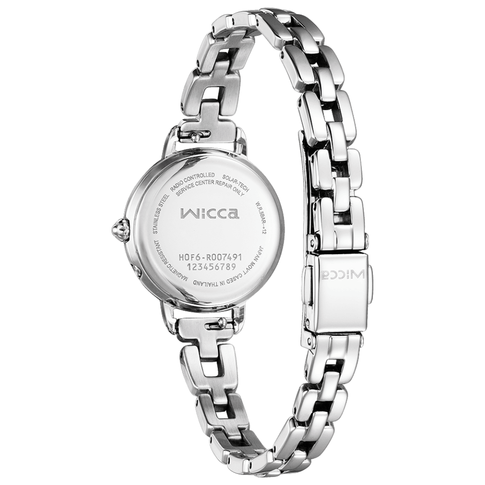 Citizen Wicca Limited Edition KL0-511-21 - ladies watch manufactured by Citizen. It is equipped with Japanese solar quartz movement and H0F6 calibre. Stainless steel case of round shape. Case dimensions are 25.5 mm. in diameter and 7.2 mm. in thickness. The dial of this Citizen watch is mother of pearl. Display type: analog. This timepiece has mineral glass. Stainless steel, synthetic leather (ecopet®) band, band color: silver, white. 50 m. water resistance. The watch is from Wicca collection. The following features are equipped: antimagnetic, crystal set, power reserve indicator, radio controlled, perpetual calendar, date, limited edition.