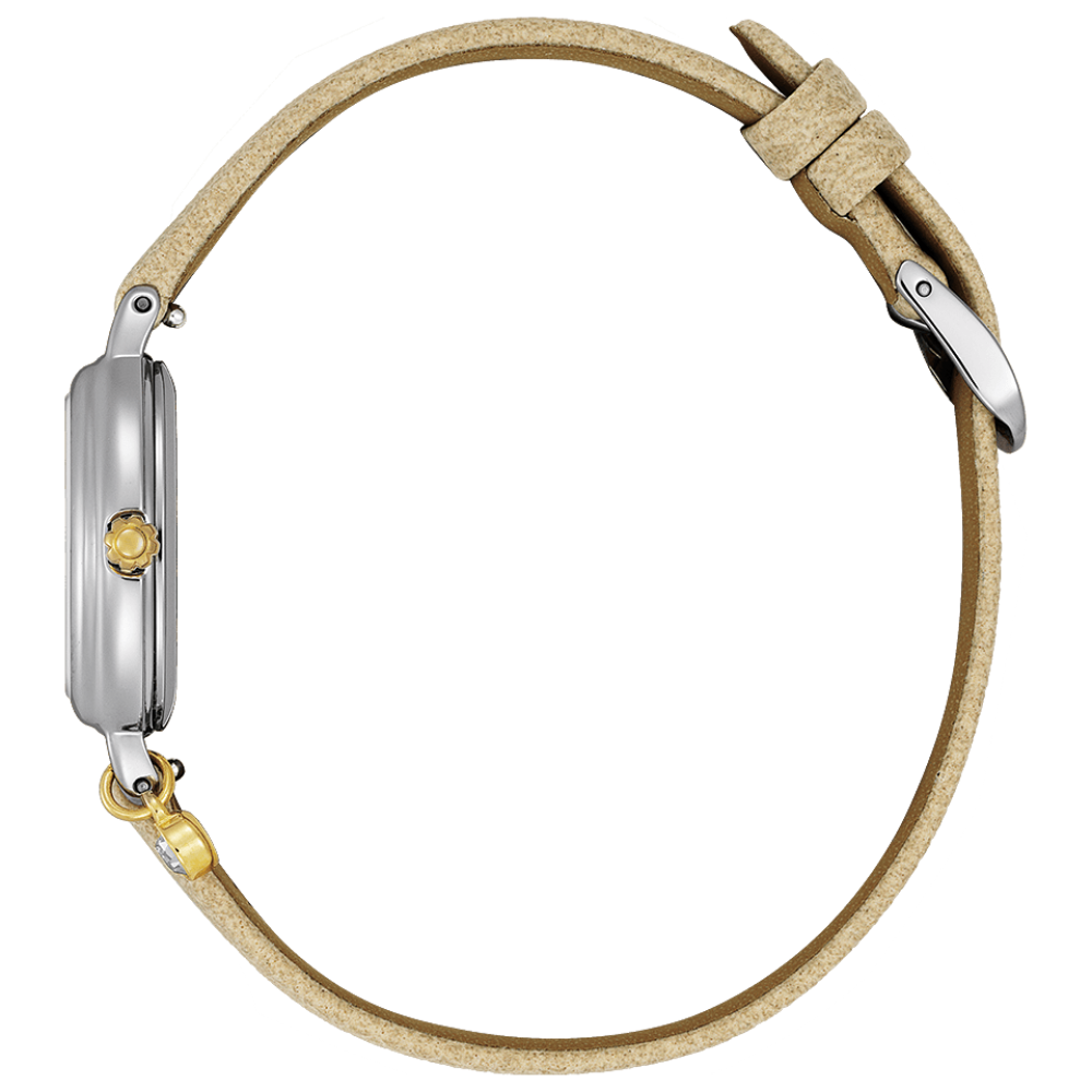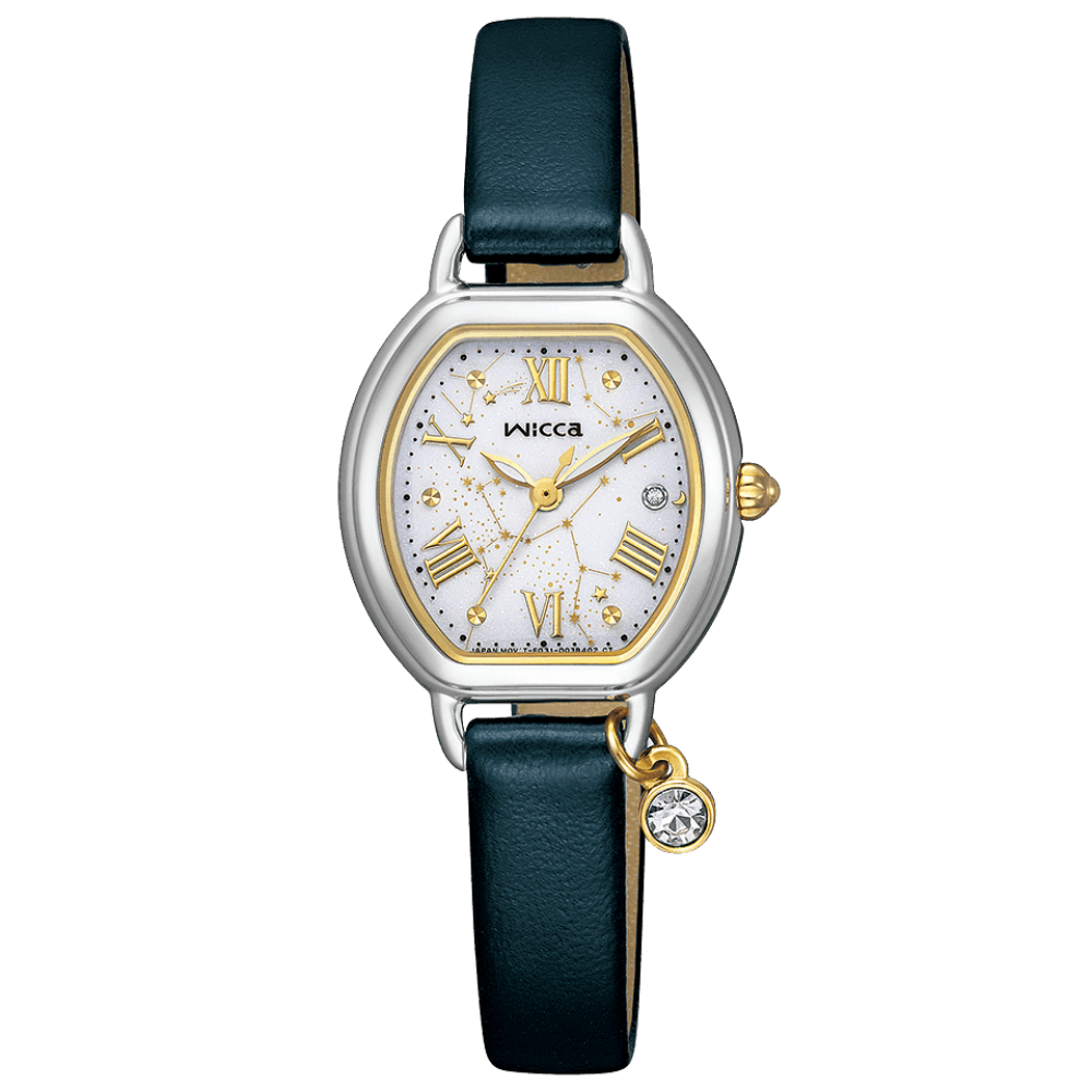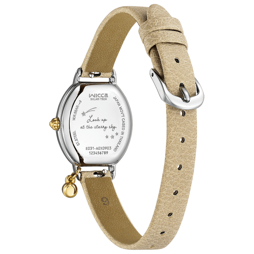 Citizen Wicca Limited Edition KP2-515-12 - ladies watch made by Citizen. It is equipped with Japanese solar quartz movement and E031 calibre. Stainless steel case of tonneau shape. Case dimensions are 23.5 mm. in diameter and 6.7 mm. in thickness. The dial of this Citizen watch is white. Display type: analog. This timepiece has mineral glass. Synthetic leather, synthetic leather (ecopet®) band, band color: beige, navy. 50 m. water resistance. The watch is from Wicca collection. The following features are equipped: crystal set, limited edition.