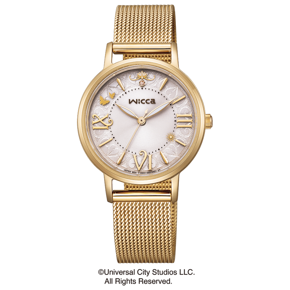 Citizen Wicca Limited Edition KP5-123-91 - ladies watch produced by Citizen. It has Japanese solar quartz movement and E031 calibre. Stainless steel, gold plated case of round shape. Case dimensions are 30.2 mm. in diameter and 7.5 mm. in thickness. The dial of this Citizen watch is pink. Display type: analog. This timepiece has mineral glass. Stainless steel, gold plated band, band color: gold. 50 m. water resistance. The watch is from Wicca collection. The following features are equipped: crystal set, glowing hands, limited edition.