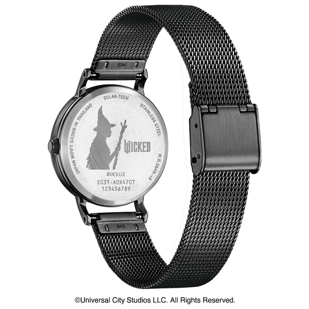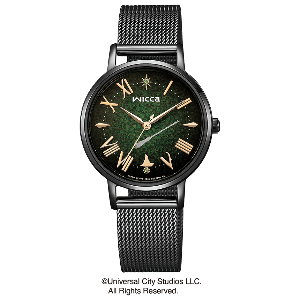 Citizen Wicca Limited Edition KP5-140-41 - ladies watch produced by Citizen. It is equipped with Japanese solar quartz movement and E031 calibre. Stainless steel, hard coating case of round shape. Case dimensions are 30.2 mm. in diameter and 7.5 mm. in thickness. The dial of this Citizen watch is dark green. Display type: analog. This timepiece has mineral glass. Stainless steel, hard coating band, band color: black. 50 m. water resistance. The watch is from Wicca collection. The following features are equipped: crystal set, limited edition.