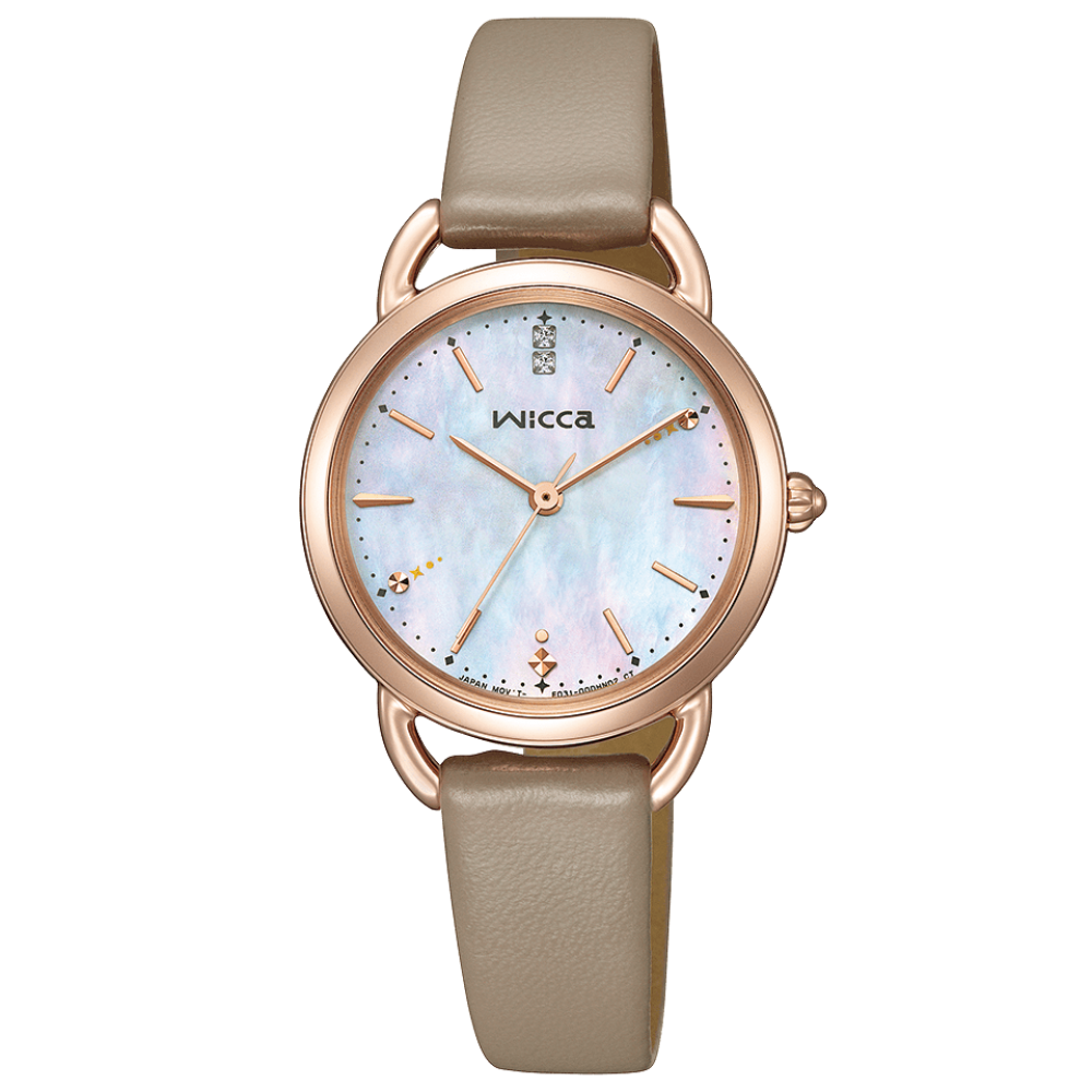 Citizen Wicca Limited Edition KP6-065-21 - ladies watch made by Citizen. It has Japanese solar quartz movement and E031 calibre. Stainless steel, gold plated case of round shape. Case dimensions are 28 mm. in diameter and 7.9 mm. in thickness. The dial of this Citizen watch is mother of pearl. Display type: analog. This timepiece has mineral glass. Stainless steel, gold plated, synthetic leather (ecopet®) band, band color: gold, brown. 50 m. water resistance. The watch is from Wicca collection. The following features are equipped: crystal set, limited edition.
